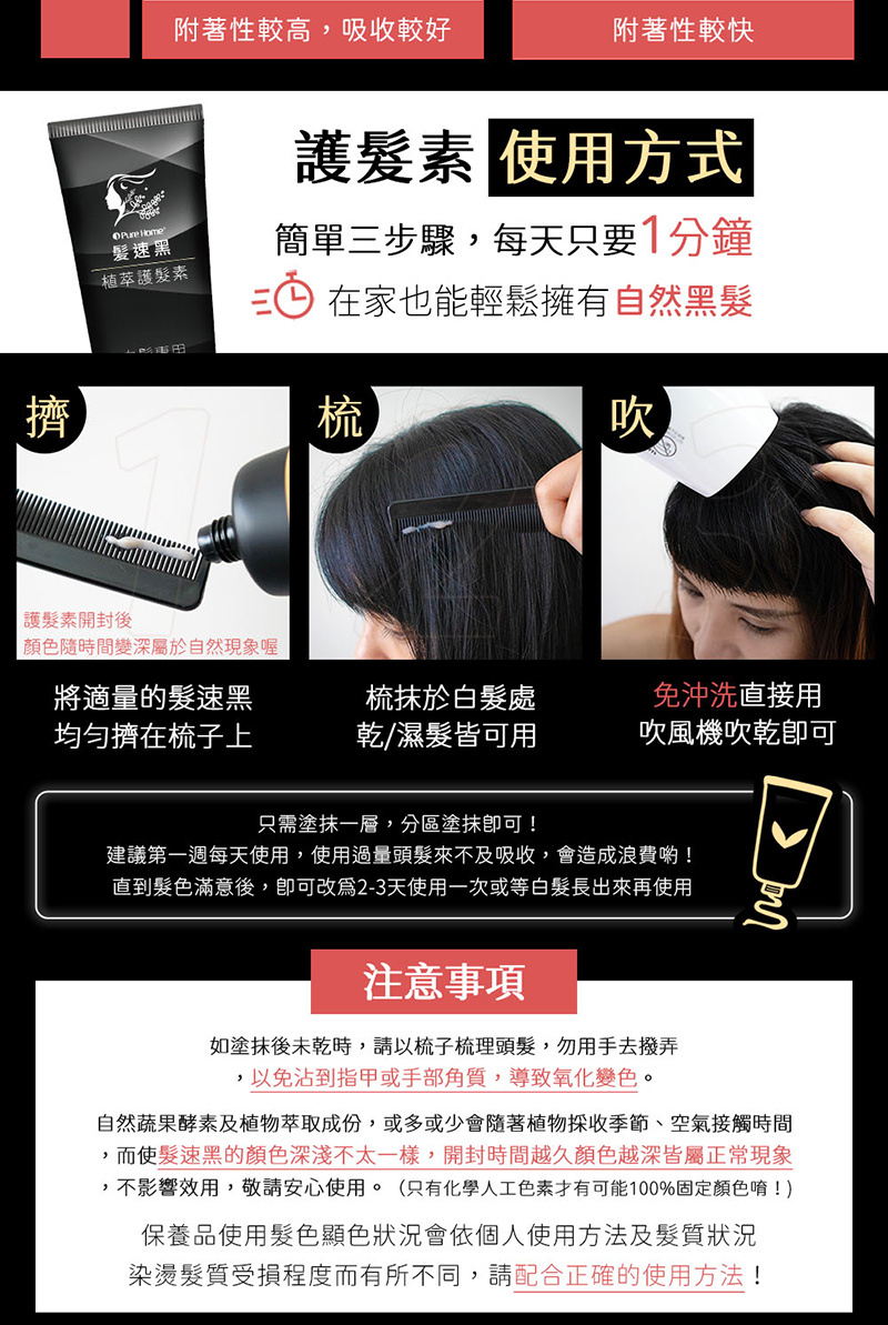 ·保養品使用髮色顯色狀況會依個人使用方法及髮質狀況染燙髮質受損程度而有所不同,請配合正確的使用方法!