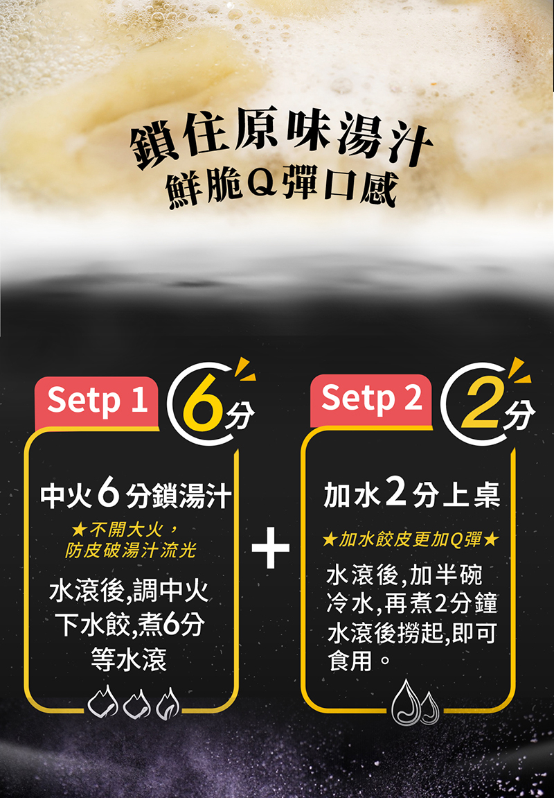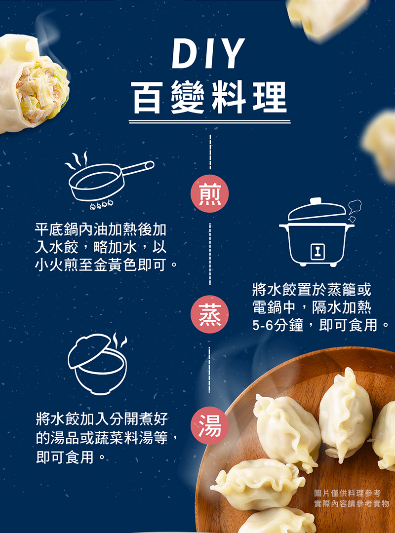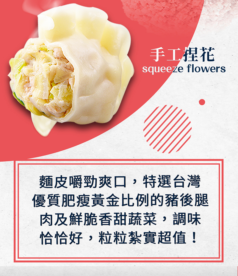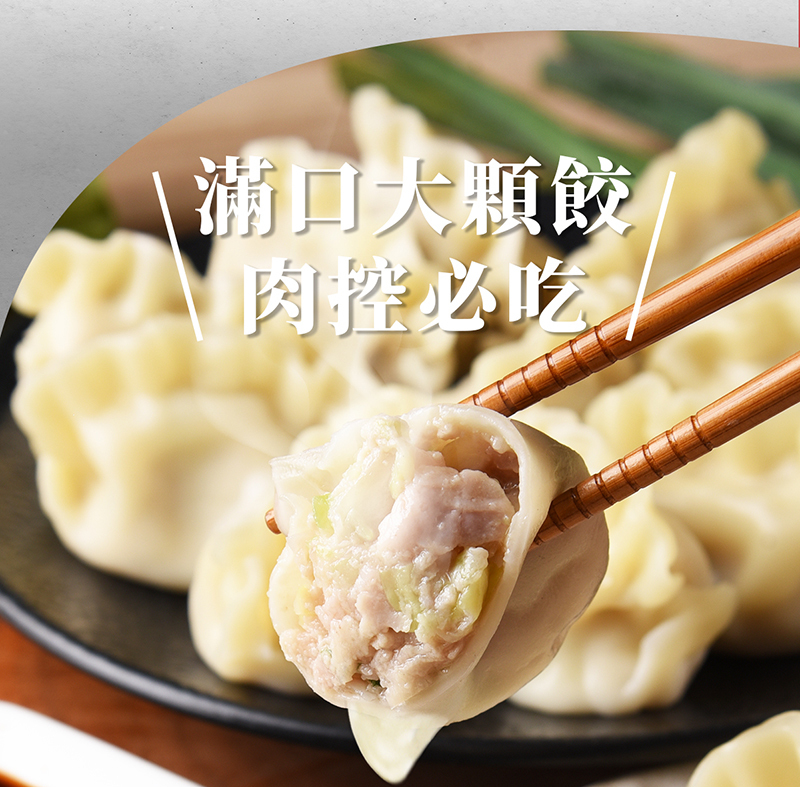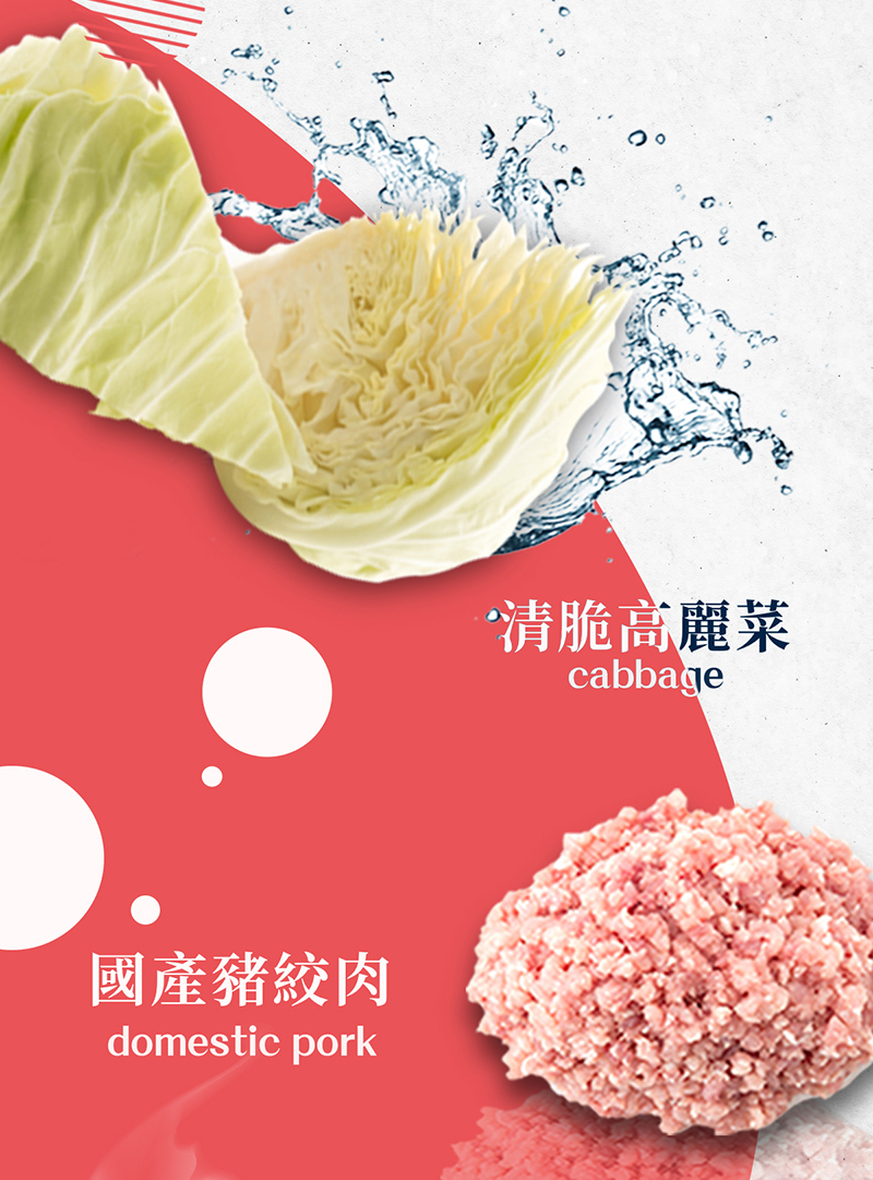 特選台灣優質豬肉後腿肉搭配檢驗合格認證的鮮脆高麗菜,內餡多汁鮮脆、外皮Q彈,讓您每一口都吃得到肉的香味和高麗菜的甜味,每一顆餃子足足28g,內陷紮實飽滿、顆顆飽滿。