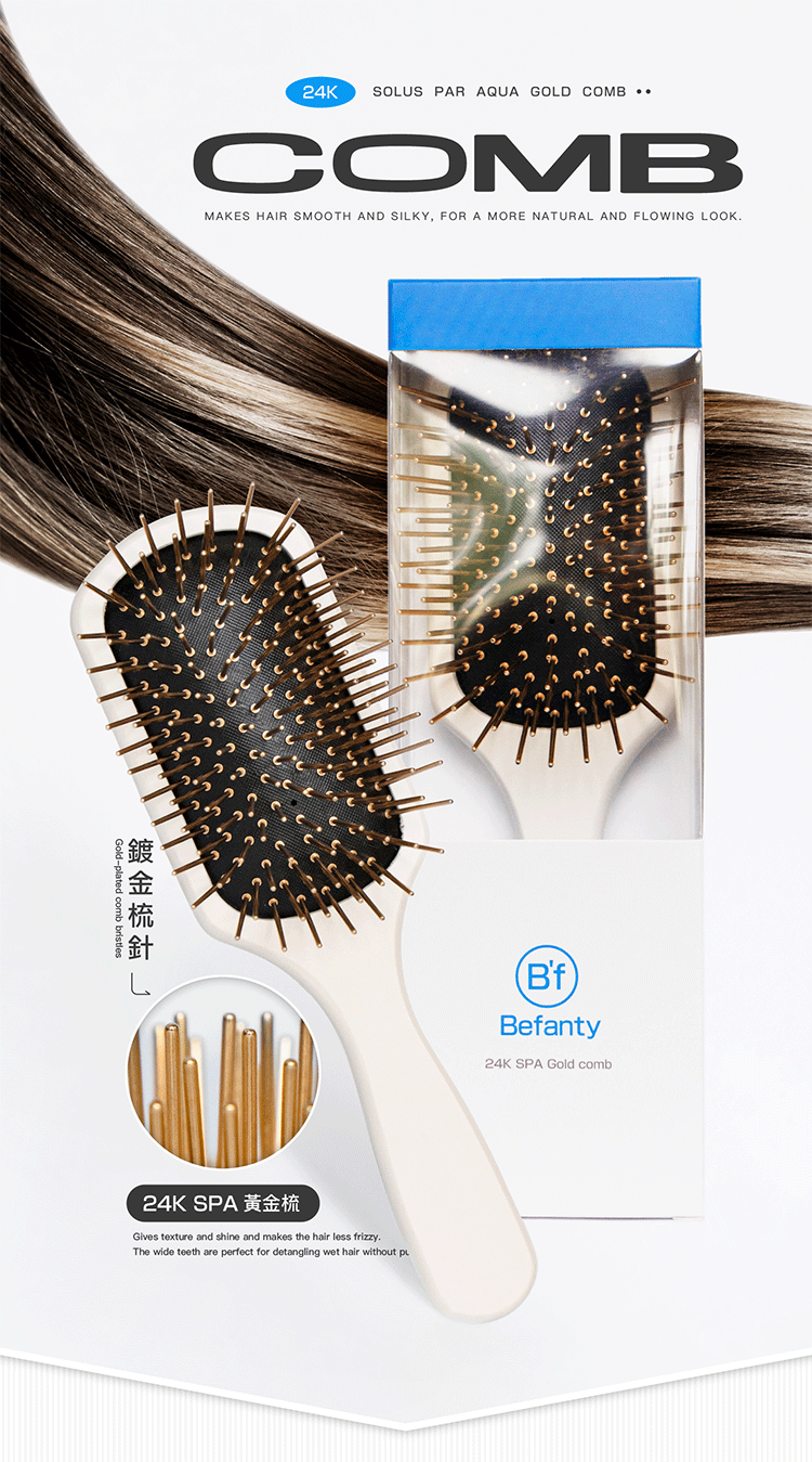 產品特點:24K金鍍黃金梳針,純手工打造,天然橡膠氣墊,採用24K緞金金針梳,抗靜電不糾結,使秀髮平順柔滑,搭配純手工梳炳,圓潤手感溫潤飽滿,透過頭皮肌膚接觸、梳理、氣墊按摩,促進血液循環,具極佳提神醒腦效果,同時保健頭皮護理髮根,使毛髮放輕鬆,更加自然飄逸。