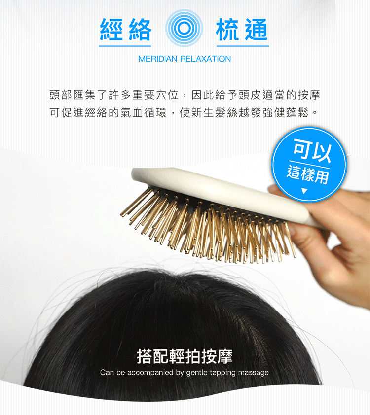 用途:藉由黃金梳針梳理,加強按摩頭皮的角質層,配有彈性氣墊設計,梳頭時能另疏齒緊貼頭皮,冰涼舒適與舒壓。