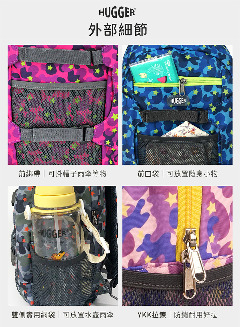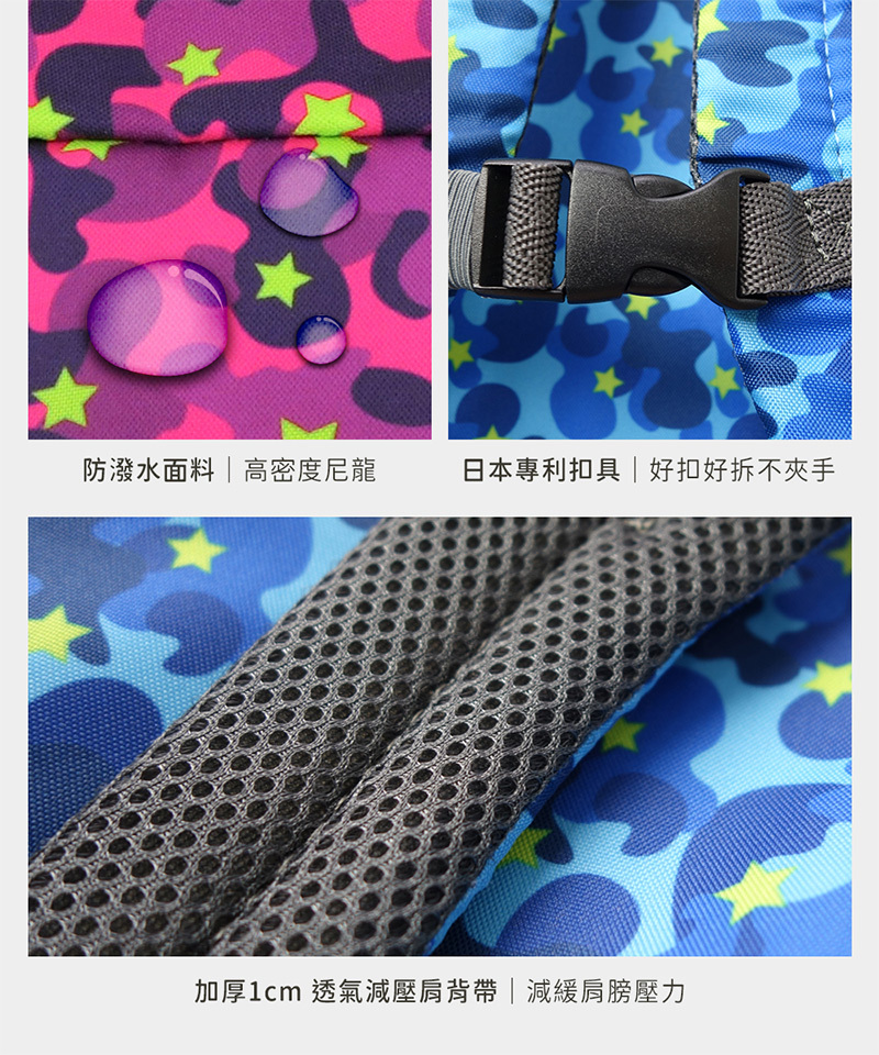 選用高密度尼龍布、日本專利扣具、YKK拉鍊,為孩童打造輕量、耐用、安全的背包