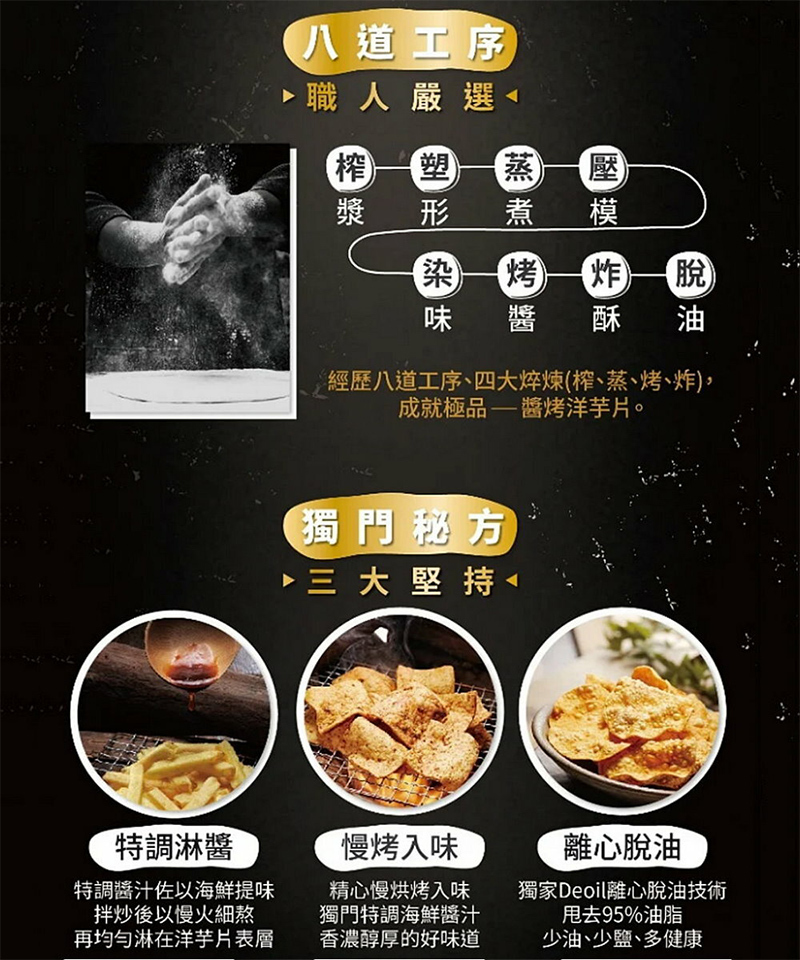 KAKA三大特色「獨門醬汁、手工醬烤、離心脫油」,讓餅乾風味更佳!KAKA獨有食品級「Deoil離心脫油」技術更讓餅乾乾燥、清爽,包裝內袋無多餘油脂殘留,讓您放心享用零食!