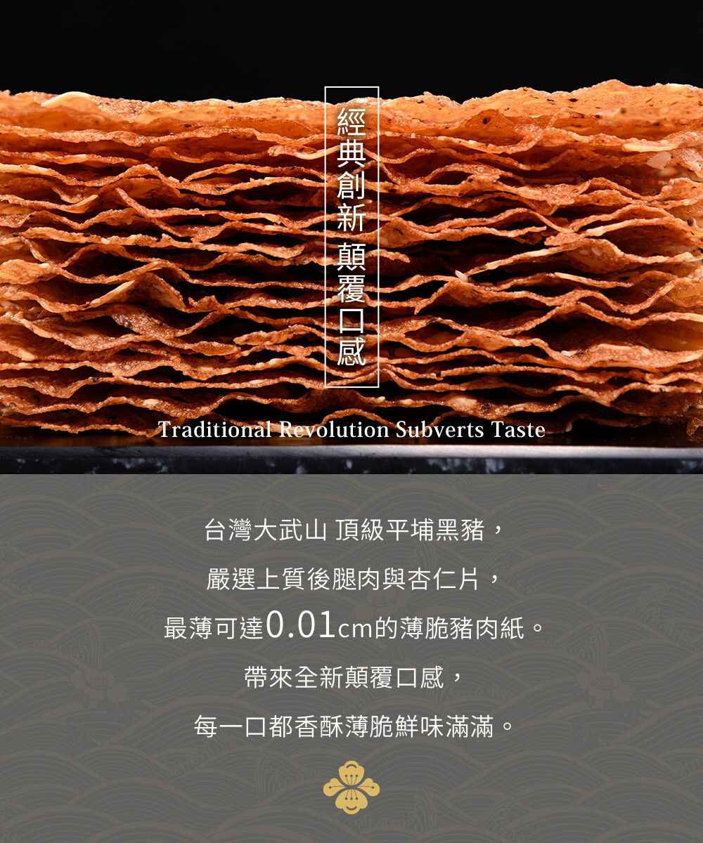 保留豬肉獨有香氣並以杏仁提味,酥脆的肉紙薄如蟬翼,咔滋咔滋的絕妙口感,