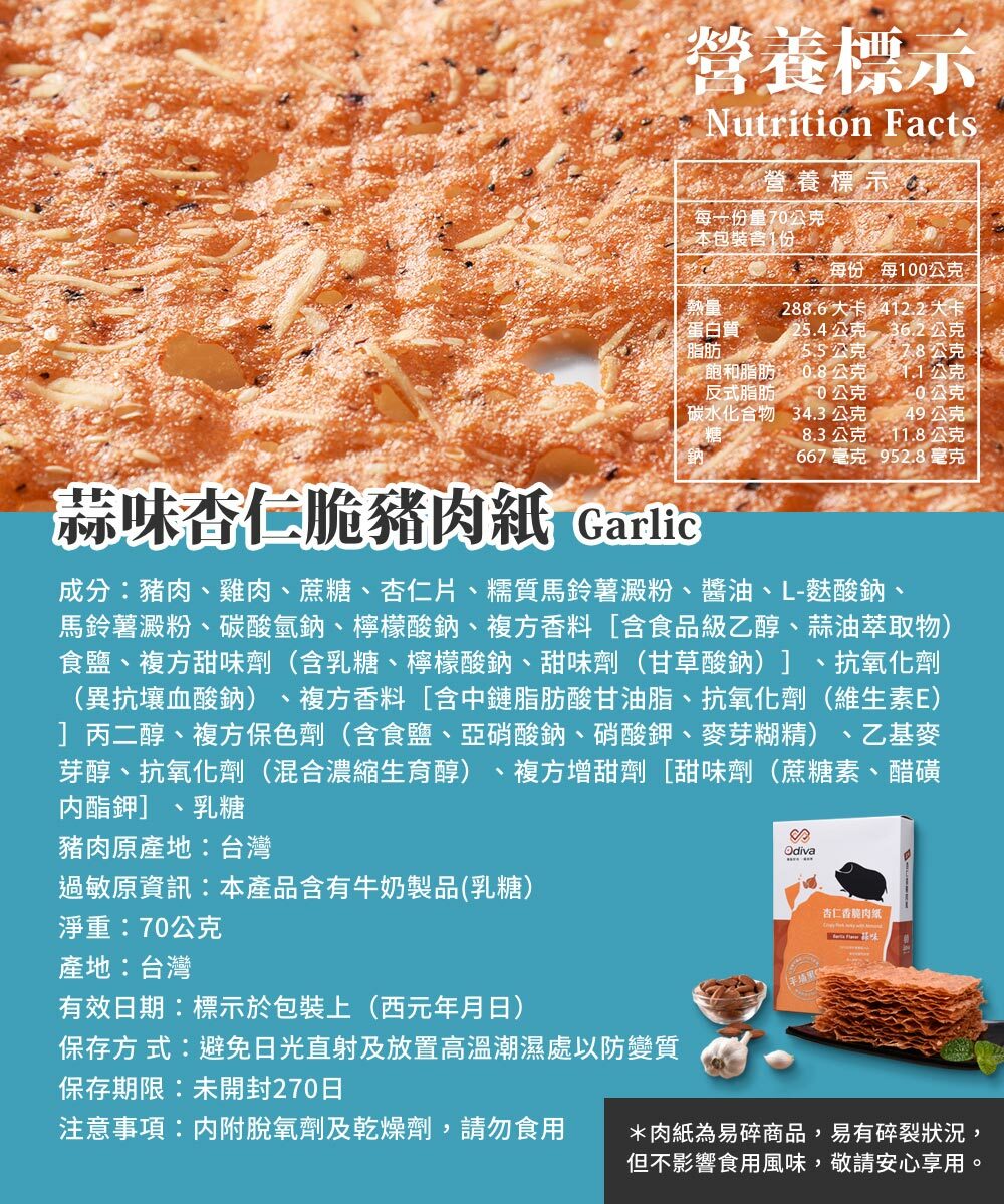 包裝內容物 : 3盒/組 (原味杏仁脆豬肉紙/盒+蒜味杏仁脆豬肉紙/盒+黑胡椒杏仁脆豬肉紙/盒)