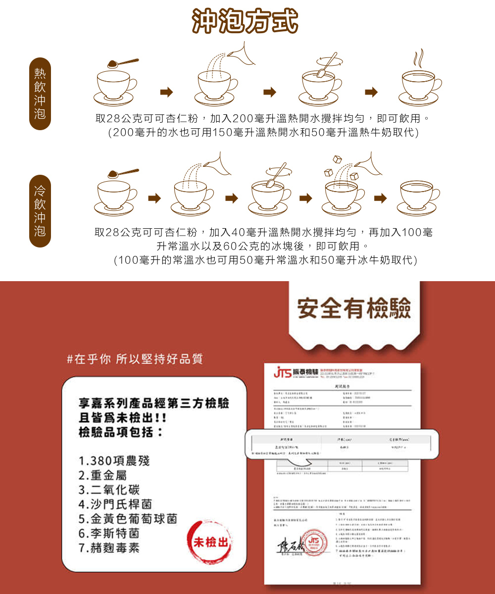 熱泡:取1包可可杏仁茶,加入200毫升溫熱開水攪拌均勻,即可飲用。(200毫升的水也可用150 毫升溫熱開水和50毫升溫熱牛奶取代,亦可依個人口味加糖)