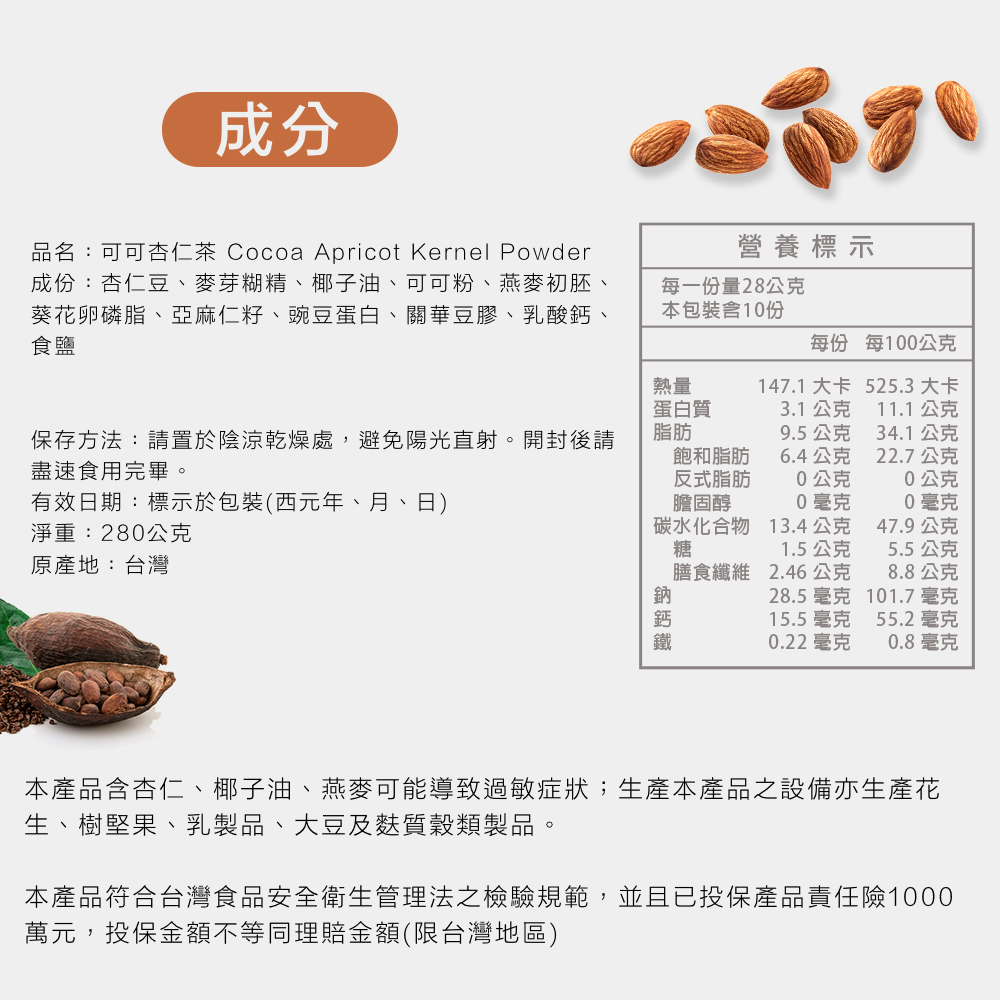 成分:杏仁豆、麥芽糊精、椰子油、可可粉、燕麥初胚、葵花卵磷脂、亞麻仁籽、豌豆蛋白、關華豆膠、乳酸鈣、食鹽