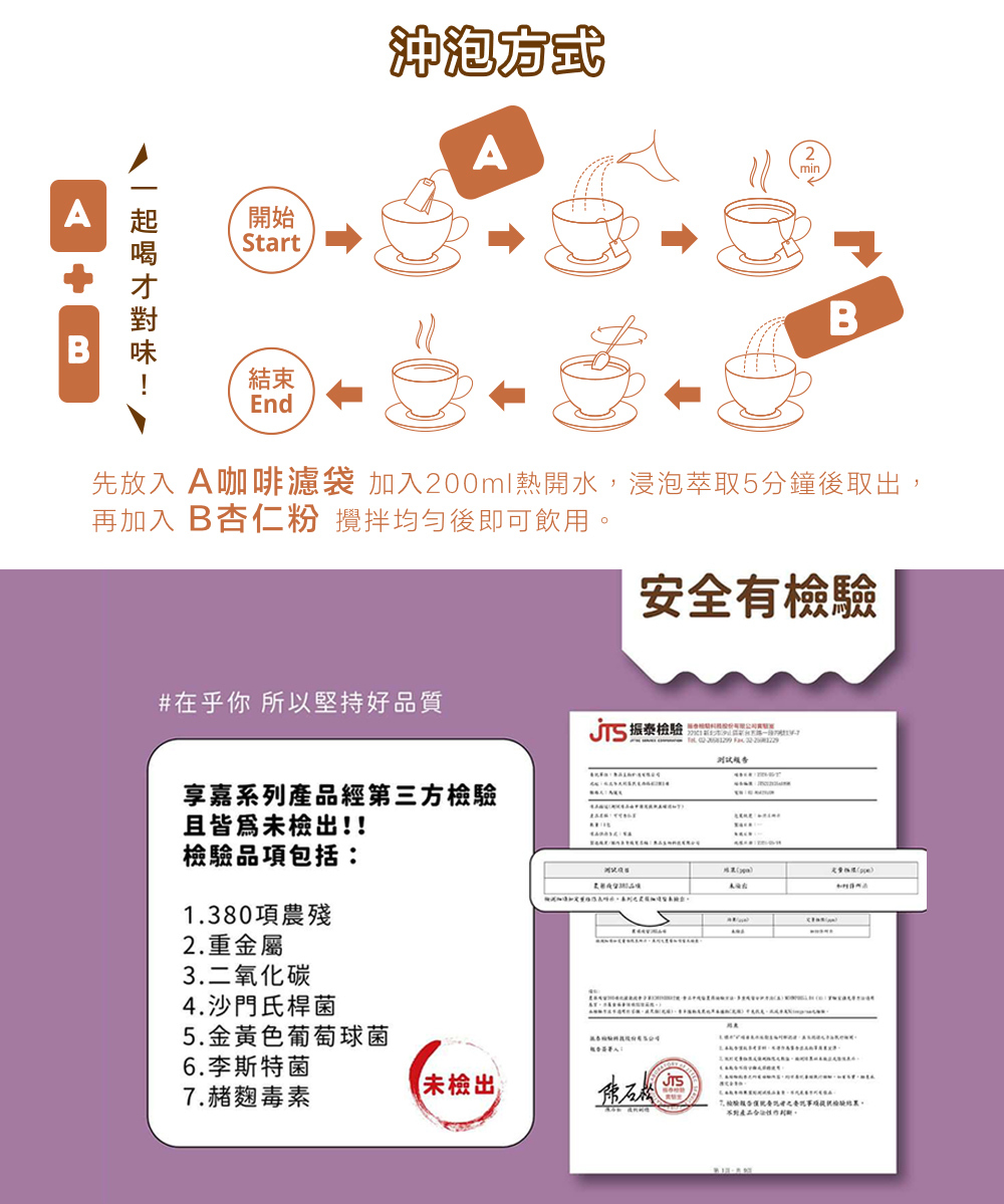 熱泡:先放入A咖啡濾袋加入200 ml熱開水,浸泡萃取5分鐘後取出,再加入B杏仁粉攪拌均勻後即可使用。