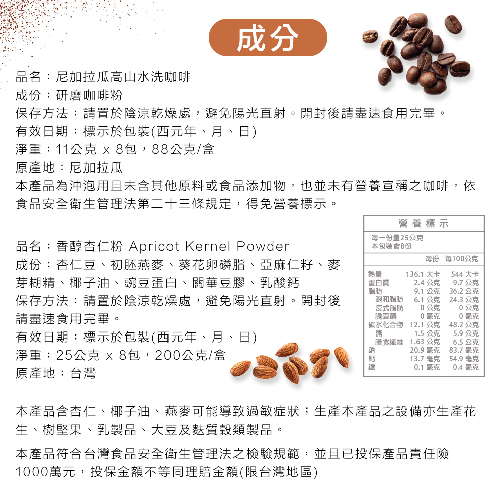 內容物:尼加拉瓜高山水洗咖啡11gx8包+香醇杏仁粉25gx8包