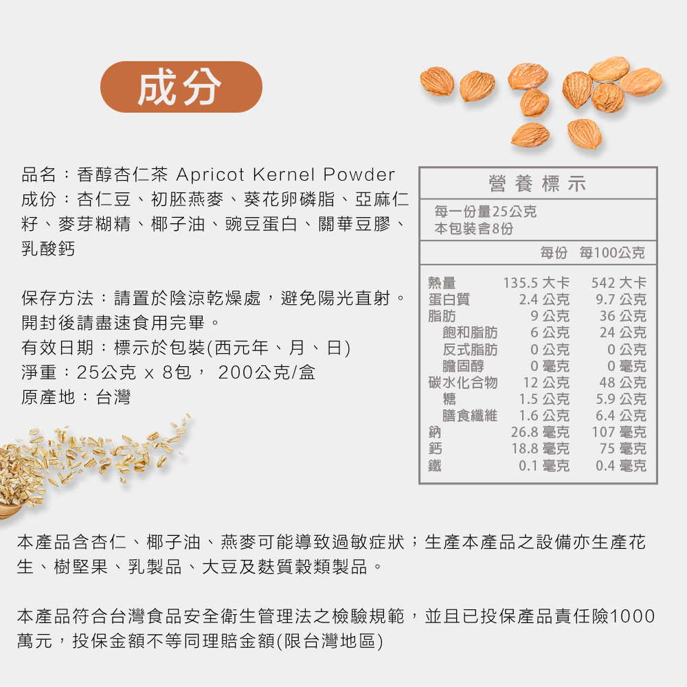 成分:杏仁豆、初胚燕麥、葵花卵磷脂、亞麻仁籽、麥芽糊精、椰子油、豌豆蛋白、關華豆膠、乳酸鈣