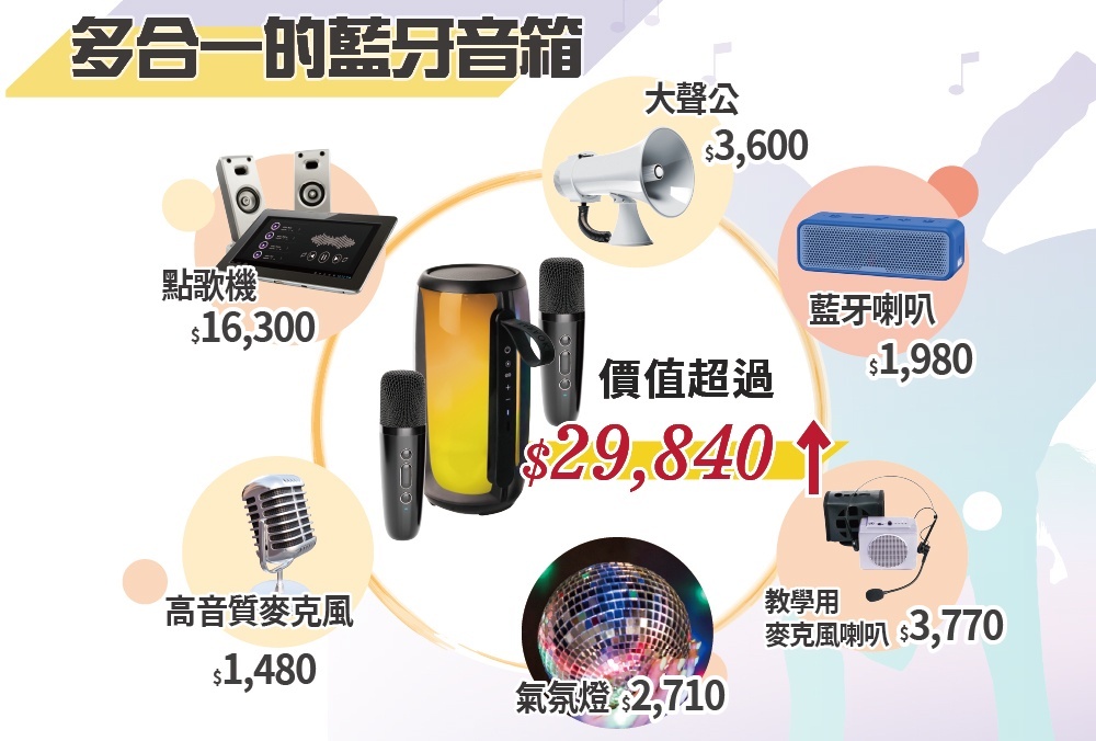 麥克風:開機/ 麥克風音量加/ 麥克風音量減/ 消除原音 四個實體按鍵/ 迴音(Echo混響調整)