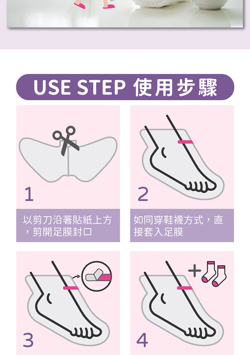 使用方法: 取出足膜沿虛線剪開 · 將雙足套入足膜中 · 由內側撕去紅色膜 · 封好開口處,以手輕壓膜布外層 · 約20分鐘後即可將足膜脫下 · 不用洗淨, 精華液可以直接塗抹輕拍吸收。
