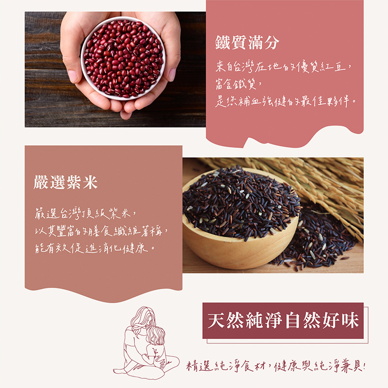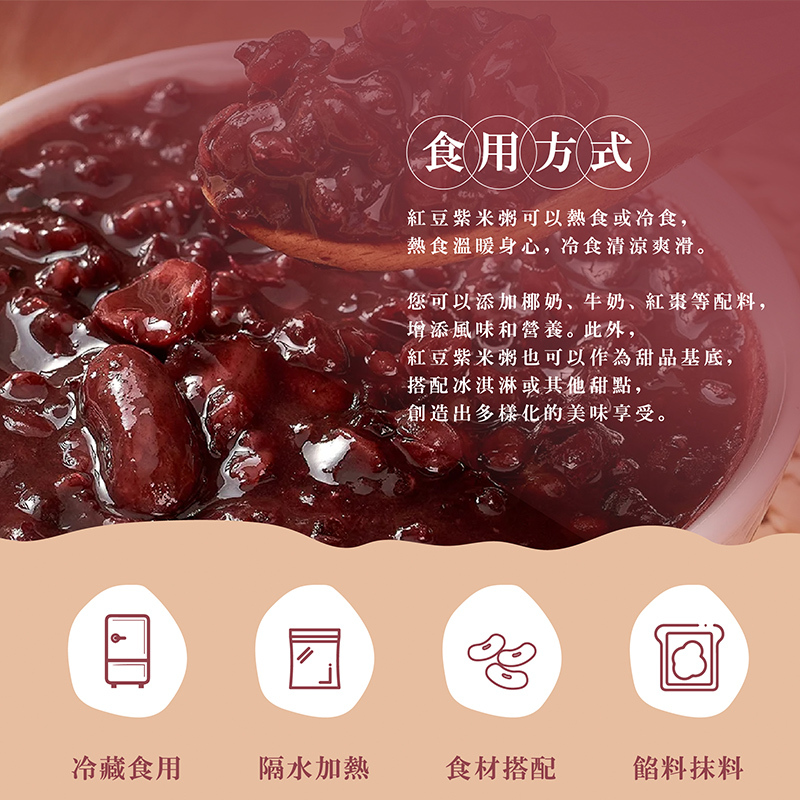 •冬天隔水加熱、炎炎夏日預先放置冰箱,均可品嚐濃郁可口的紅豆紫米粥。