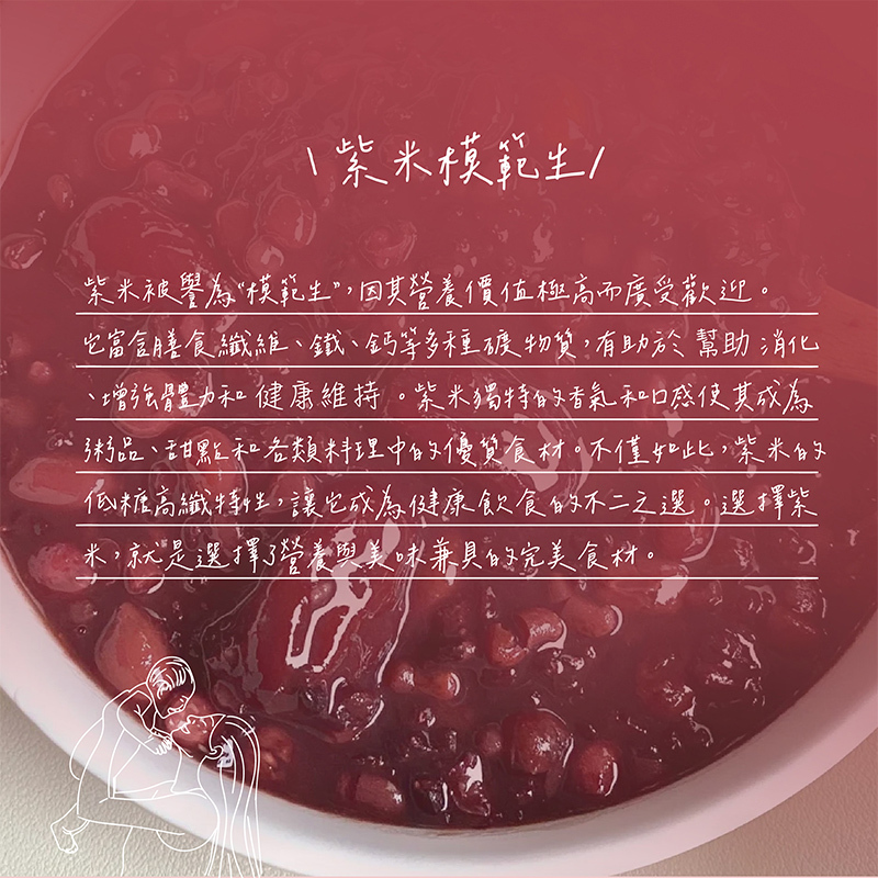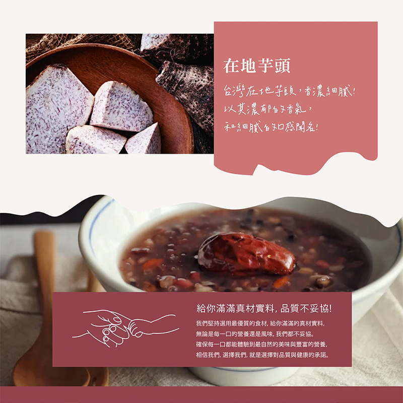 選用雲林紫米及屏東紅豆,特別添加芋頭,以冰糖慢火熬煮,涼品的好夥伴!加牛奶加湯圓,怎麼搭配都好吃。