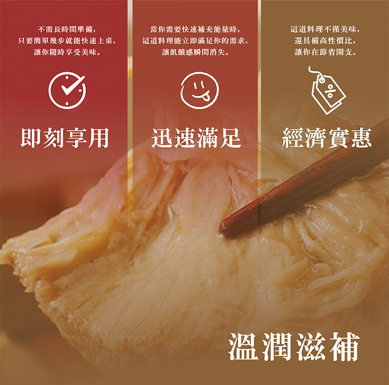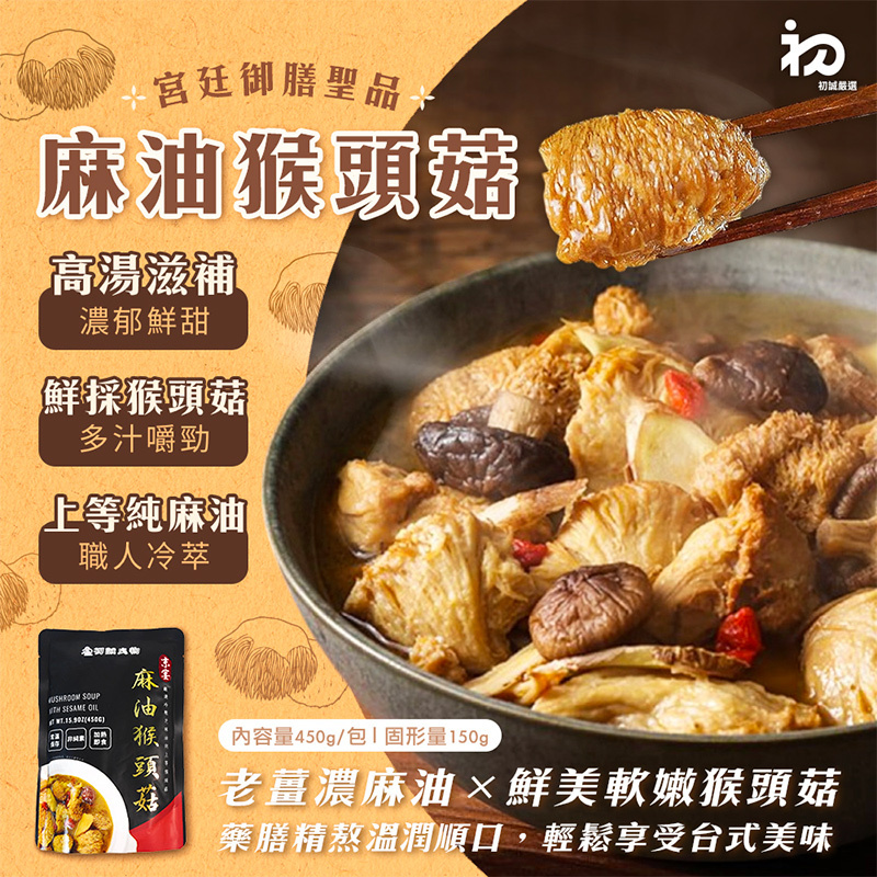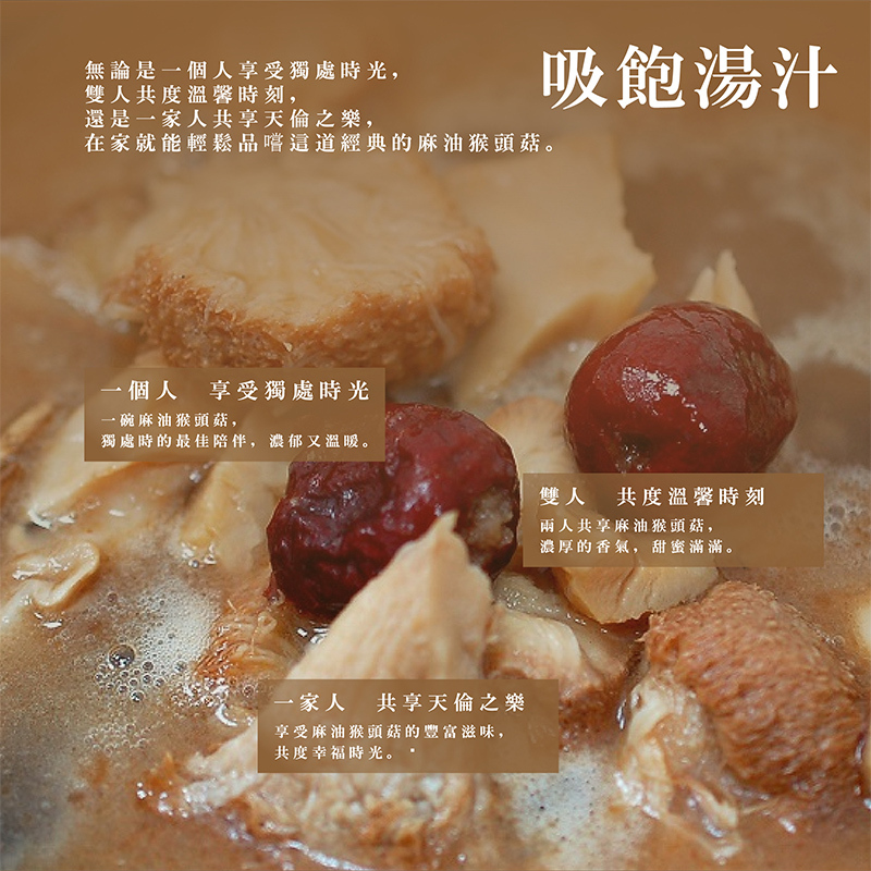 進補不必大費周章,在家就能輕鬆搞定,簡單加熱就能快速品嚐,嚴選兩大食材「高山鮮採猴頭菇」、「香醇冷榨芝麻油」,先以冷榨芝麻油將老薑煸香,再加入猴頭菇快速拌炒,再加入水、米酒及多種漢方中藥材慢火燉煮,湯頭濃郁鮮甜、溫潤順口,祛寒進補不燥熱,更導入獨家烹調技術,讓猴頭菇口感充分入味還能鮮嫩可口!一口咬下直接爆汁彈牙,簡直不要太滿足!
