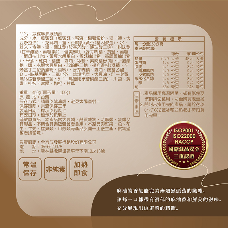 過敏原資訊:本產品含大豆類、麩質穀物、芝麻類、蛋類及其製品,不適合其過敏體質者食用。