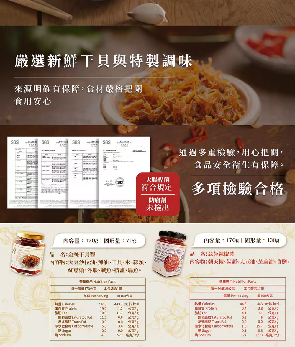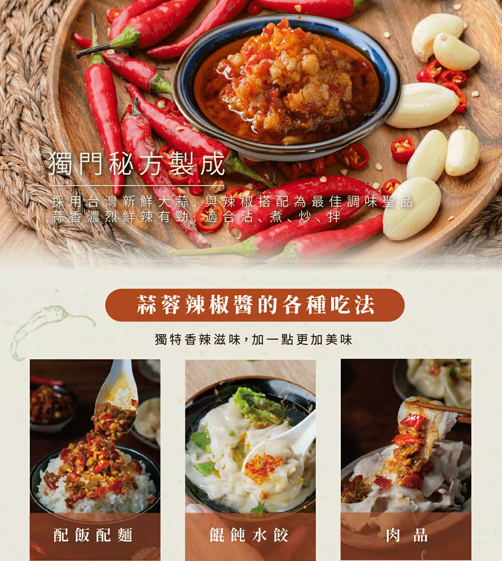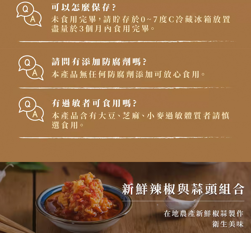 成分:朝天椒、蒜頭、大豆油、芝麻油、食鹽。
