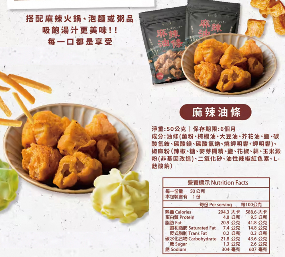 成分:油條(麵粉、大豆油、芥花油、鹽、碳酸氫銨、碳酸鎂、碳酸氫鈉、燒鉀明礬、鉀明礬)、椒麻粉、二氧化矽、油性辣椒紅色素、L-麩酸鈉