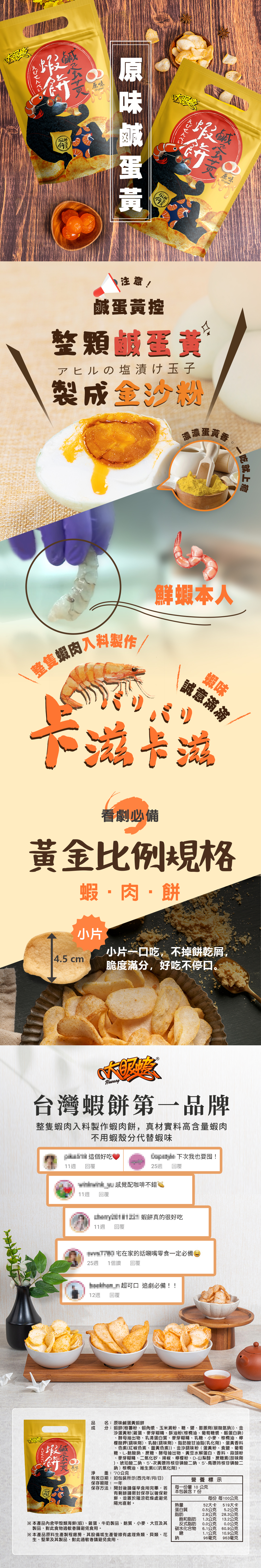 成份:蝦餅(樹薯粉、蝦肉漿、玉米澱粉、糖、鹽、膨脹劑(酸性焦磷酸鈉))、棕櫚油、鹹蛋黃粉(雞蛋、麥芽糊精、酥油粉(棕櫚油、葡萄糖漿、酪蛋白鈉)、酵母抽出物、乳