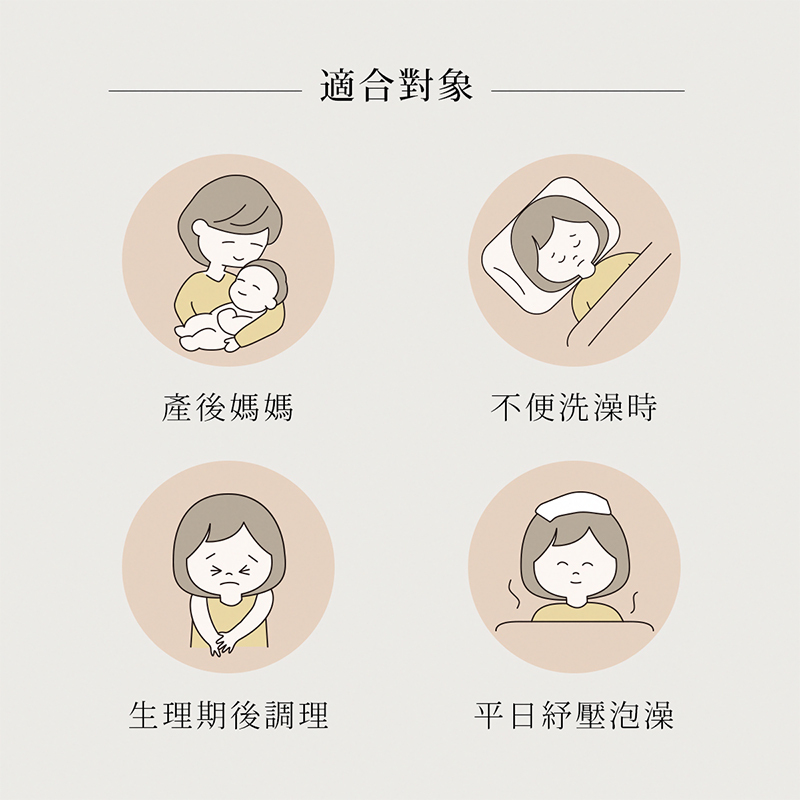 平時日常忙碌的人生,利用足沐湯浴包泡澡泡腳,適時放鬆身心,也很適合作為消除一天疲勞的小小睡前儀式,促進新陳代謝、安神、舒緩放鬆、幫助入睡,小小一包替每個偉大的產婦,打造一場舒壓放鬆的個人時光!