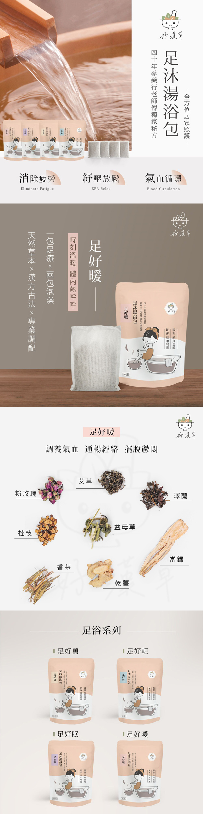 好漢草足沐湯浴包,由40多年蔘藥行老師傅精心調製而成。