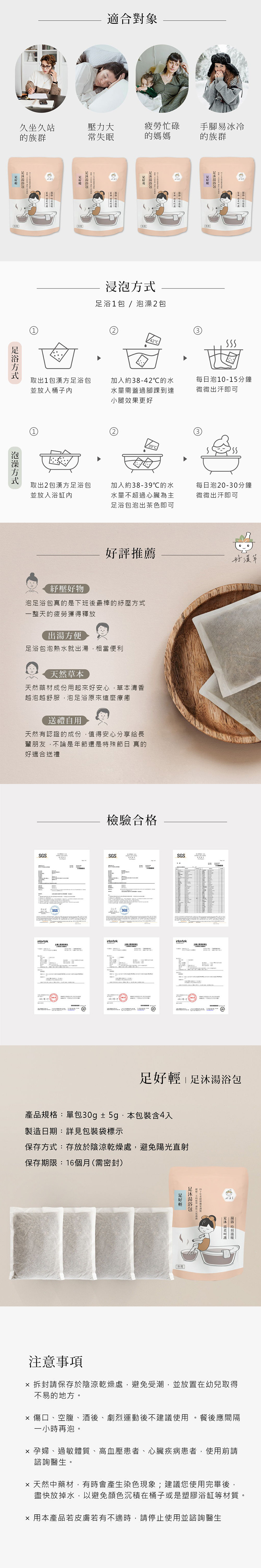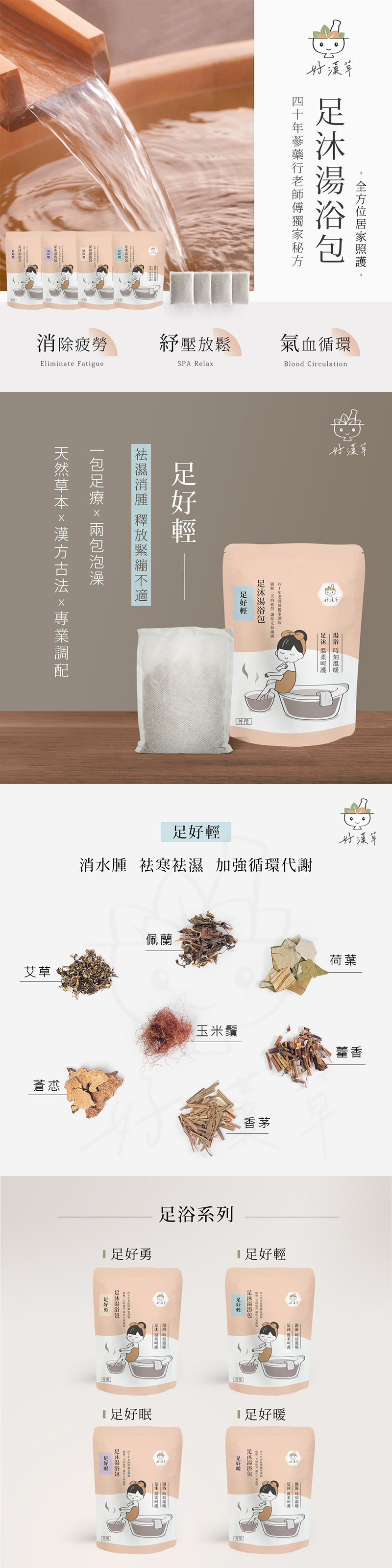 為您解開每日勞累的結,緩解飲食不規則、久坐久站循環不良腳水腫的困擾。一包足好輕足浴包讓你了解泡腳的多重好處!