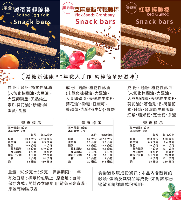 亞麻蔓越莓輕脆棒 規格:98g±5g/7支/包