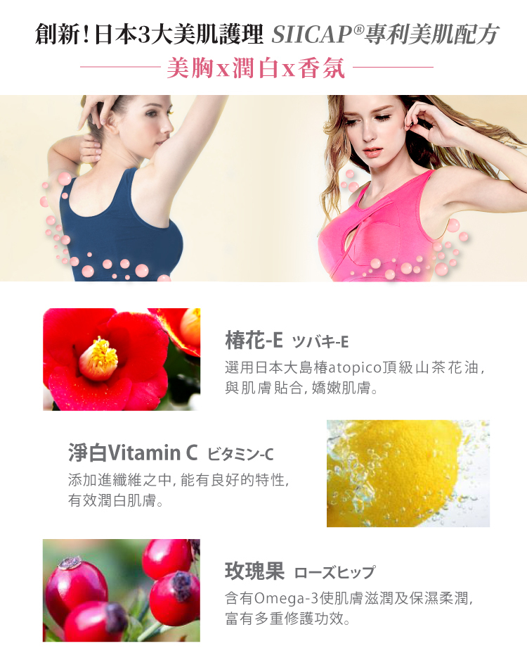 *美胸專利配方:玫瑰C+椿油E,3週嫩白有感