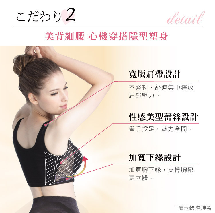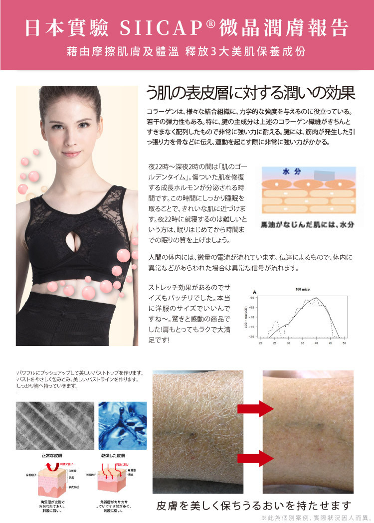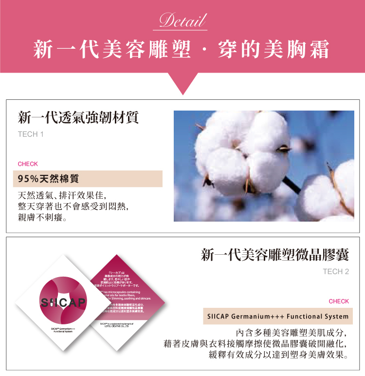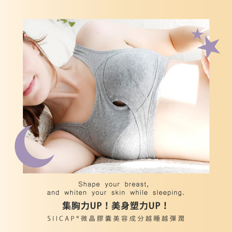 產品特色:全新升級!不只美型更要美膚,利用肌膚摩擦,釋放微晶美膚成分。日本SIICAP微晶美胸膠囊,美胸+潤白+香氛,讓你越睡越彈潤!8字扭力蝶型剪裁法,雙層包覆美胸,集中、托高、減壓,對抗地心引力,胸型更立體。親膚設計,強力彈性布,細膩親膚,吸濕、排汗、透氣,舒適塑型,長期著用更美型。