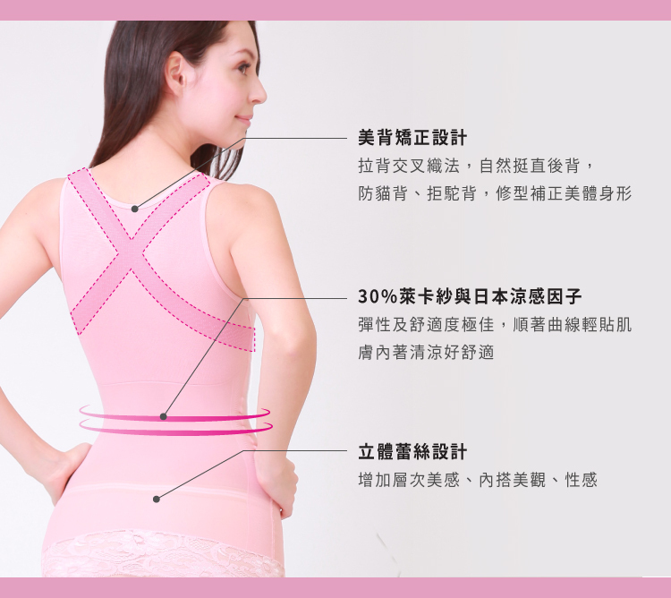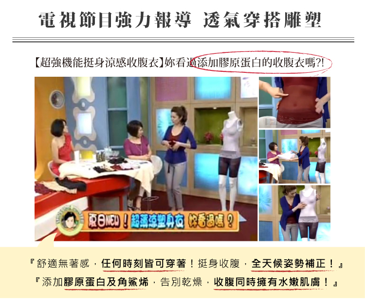 產品特色:膠原升級版!舒適無著感,任何時刻皆可穿著!挺身收腹,全天候姿勢補正