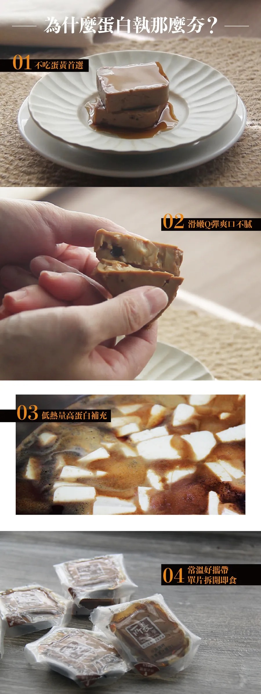 由蛋白經蒸煮後冷卻成型,切成一塊一塊,形似豆干,口感卻大不相同,滑嫩Q彈,新奇又好吃🥚