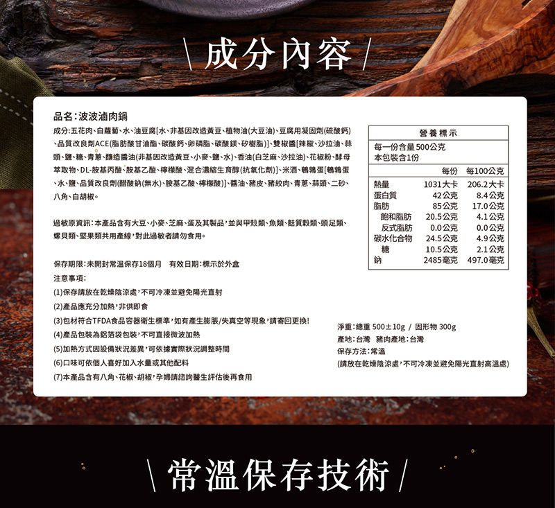 成分:五花肉、白蘿蔔、水、油豆腐[水、非基因改造黃豆、植物油(大豆油)、豆腐用凝固劑(硫酸鈣)、品質改良劑ACE(脂肪酸甘油脂、碳酸鈣、卵磷脂、碳酸鎂、矽樹脂)]、雙椒醬[辣椒、沙拉油、蒜頭、鹽、糖、青蔥、釀造醬油(非基改造黃豆、小麥、鹽、水)、香油(白芝麻、沙拉油)、花椒粉、酵母萃取物、DL-胺基丙酸、胺基乙酸、檸檬酸、混合濃縮生育醇(抗氧化劑)]、米酒、鵪鶉蛋[鵪鶉蛋、水、鹽、品質改良劑(醋酸鈉(無水)、胺基乙酸、檸檬酸)]、醬油、豬皮、豬絞肉、青蔥、蒜頭、二砂、八角、白胡椒。