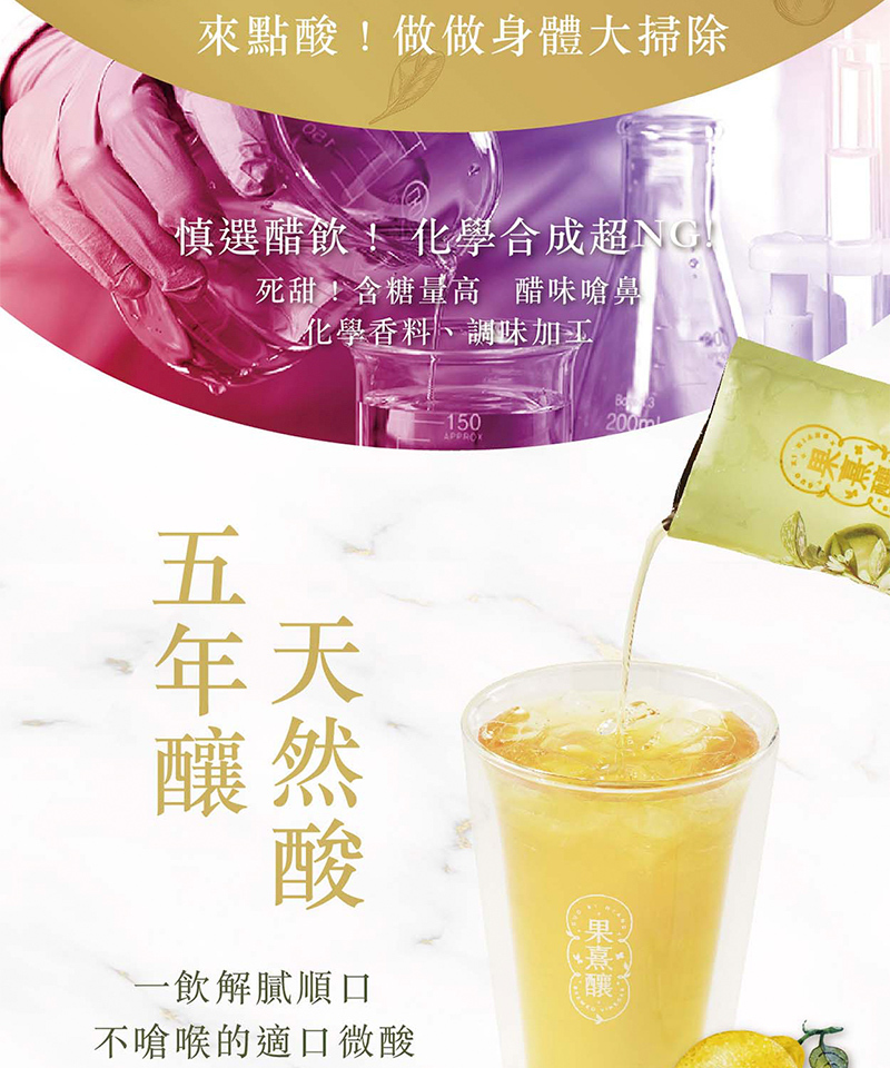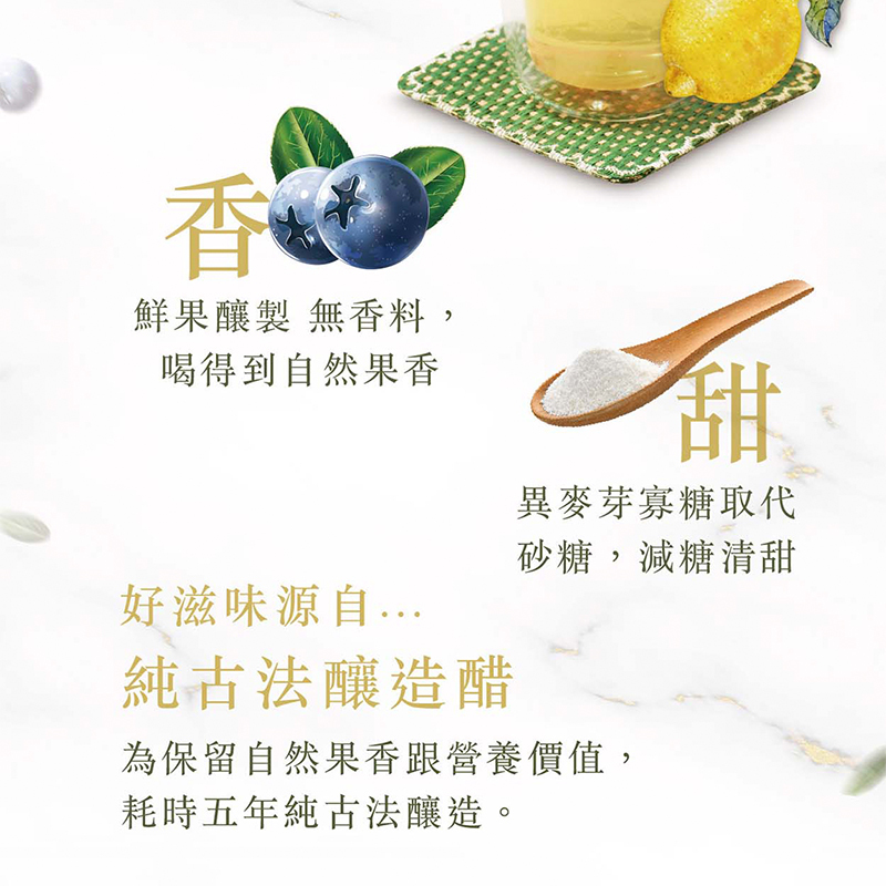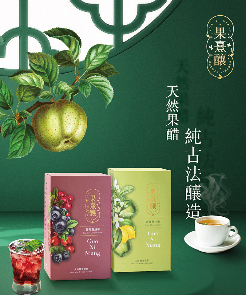 有別於一般市售合成醋,果熹釀遵循古法,嚴選優質莓果﹑青蘋果與台灣本地出產的檸檬,耗時五年釀造,精萃鮮果醇厚香味與自然酸爽,並以異麥牙寡糖取代砂糖,減糖更清甜健康。
