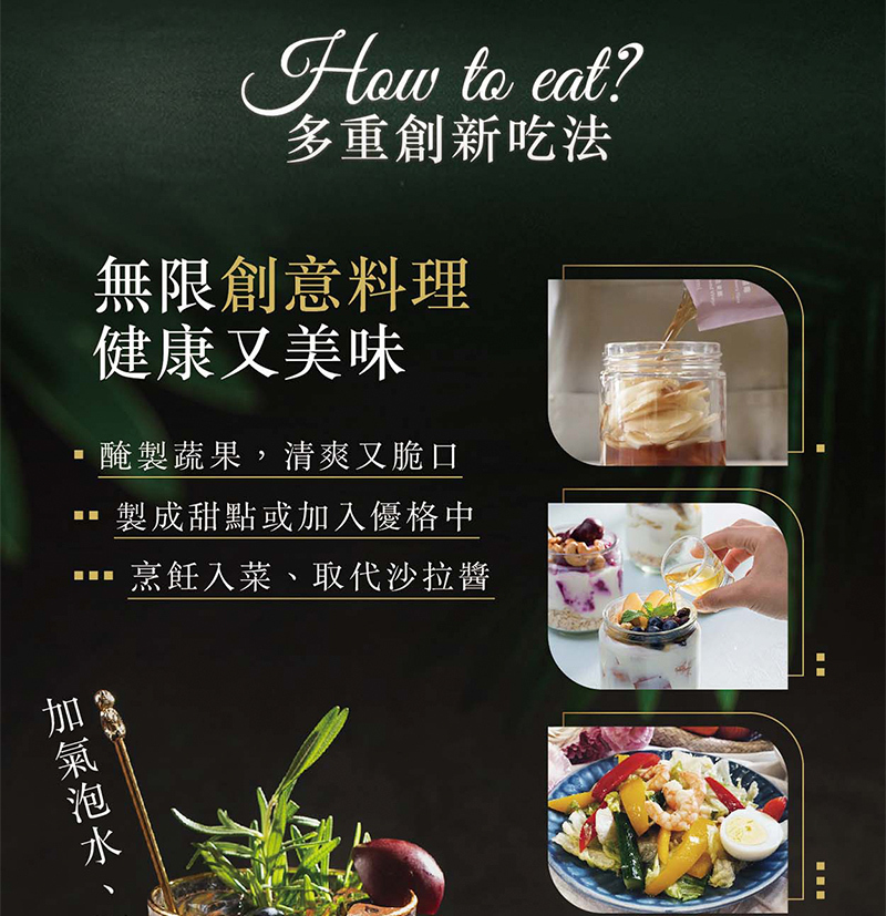 多樣食用方法,冷熱皆宜,製成飲品、入菜使用都可以!自然酸甜好滋味,讓你的生活增添許多享受!
