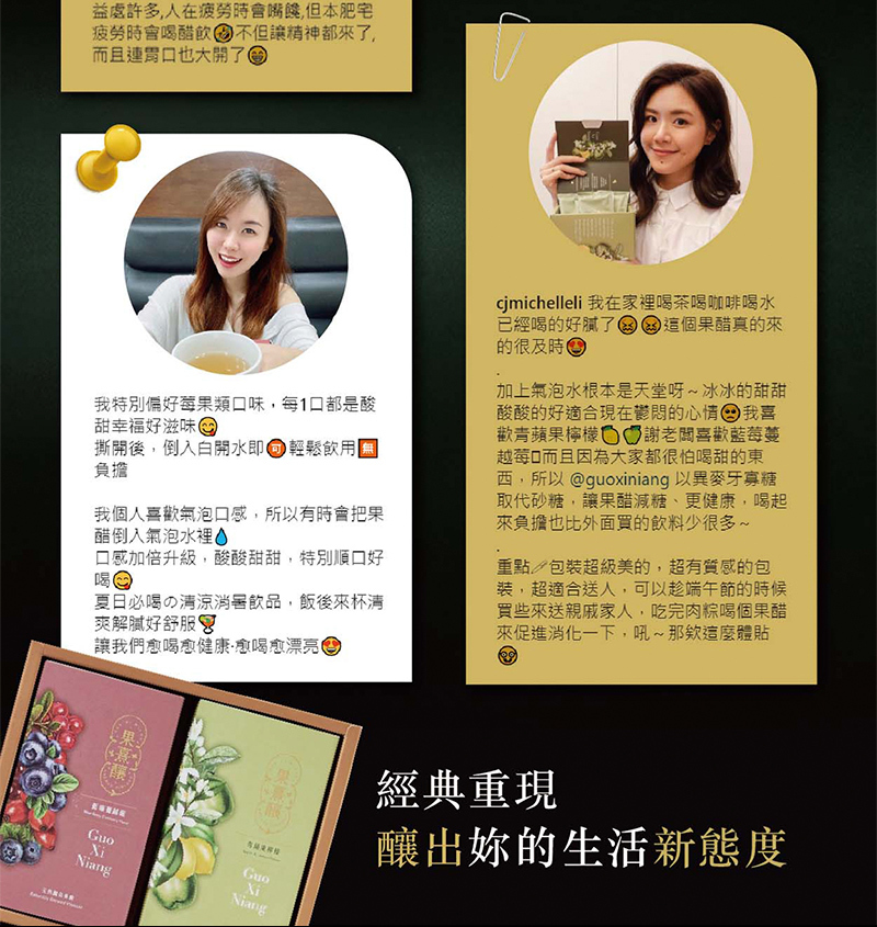 有別於一般市售合成醋,果熹釀遵循古法,嚴選優質莓果﹑青蘋果與台灣本地出產的檸檬,耗時五年釀造,精萃鮮果醇厚香味與自然酸爽,並以異麥牙寡糖取代砂糖,減糖更清甜健康。