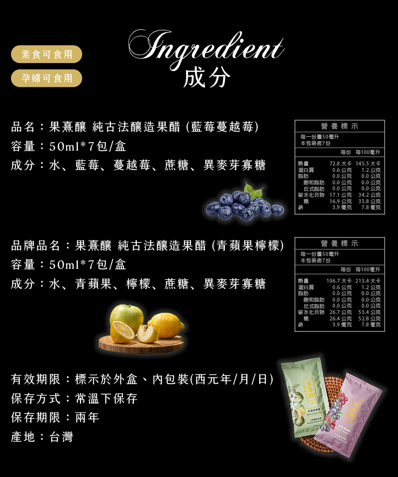 有別於一般市售合成醋,果熹釀遵循古法,嚴選優質莓果﹑青蘋果與台灣本地出產的檸檬,耗時五年釀造,精萃鮮果醇厚香味與自然酸爽,並以異麥牙寡糖取代砂糖,減糖更清甜健康。
