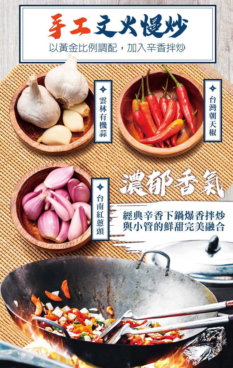蒜香爆鍋拌炒的辛香味與小管的鮮甜完美融合