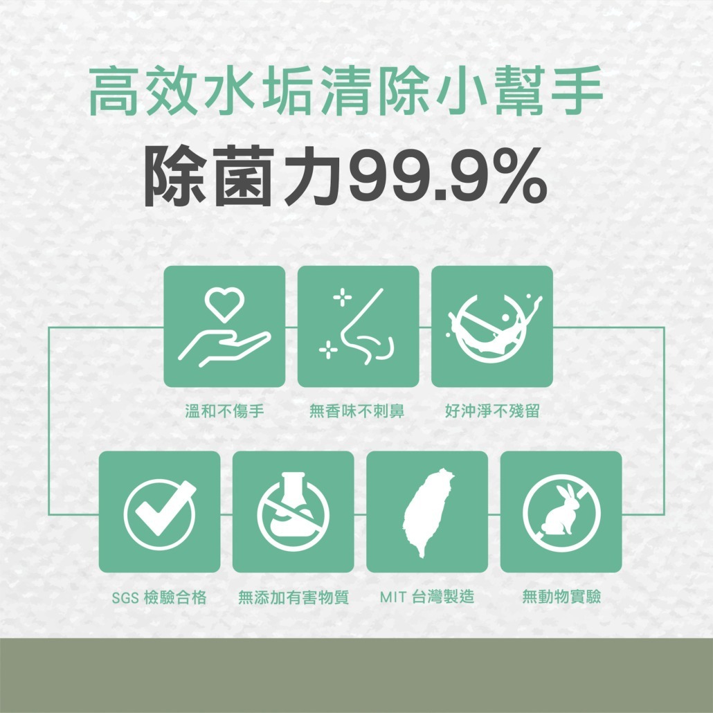有效快速溶解並清除浴室玻璃、鏡子、洗手台、不鏽鋼水龍頭、烘洗碗槽等表面上的水垢與污垢,採用全天然成分,安全、溫和,不僅能有效避免細菌滋生,還具備除菌、消臭功能!