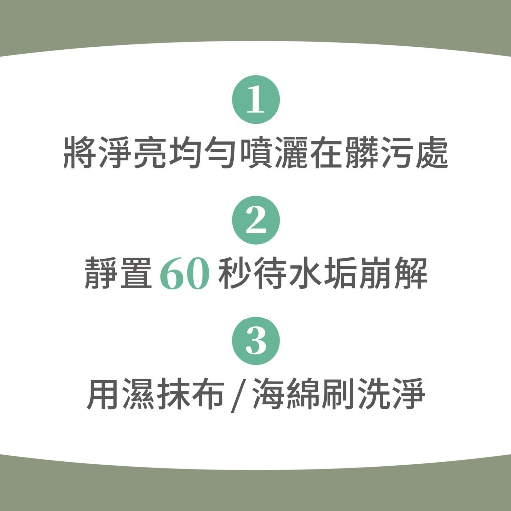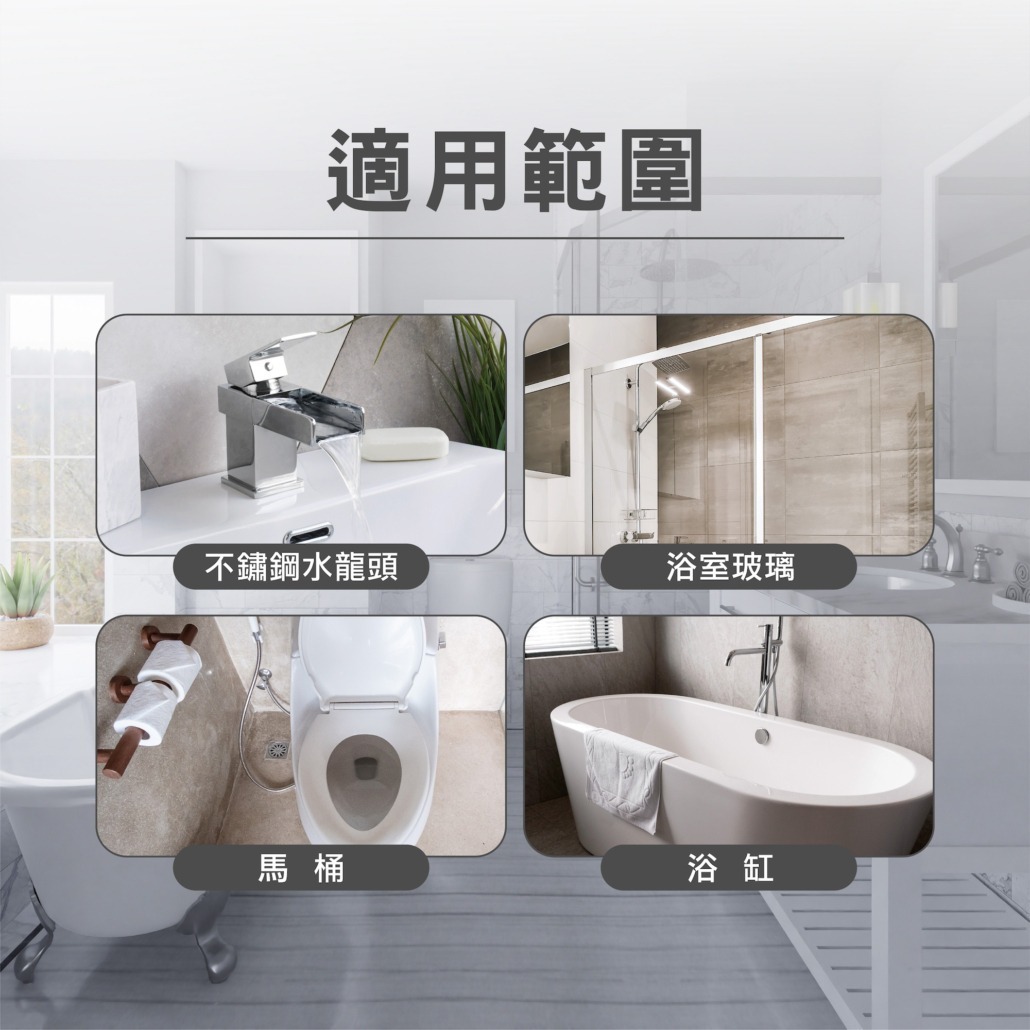 📌有效快速溶解清除浴室玻璃、鏡子、洗手台、不鏽鋼水龍頭、烘洗碗槽等材質表面上的水垢與污垢。