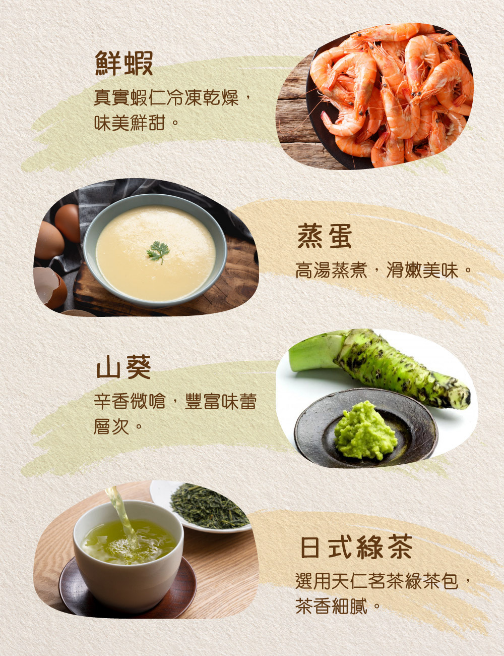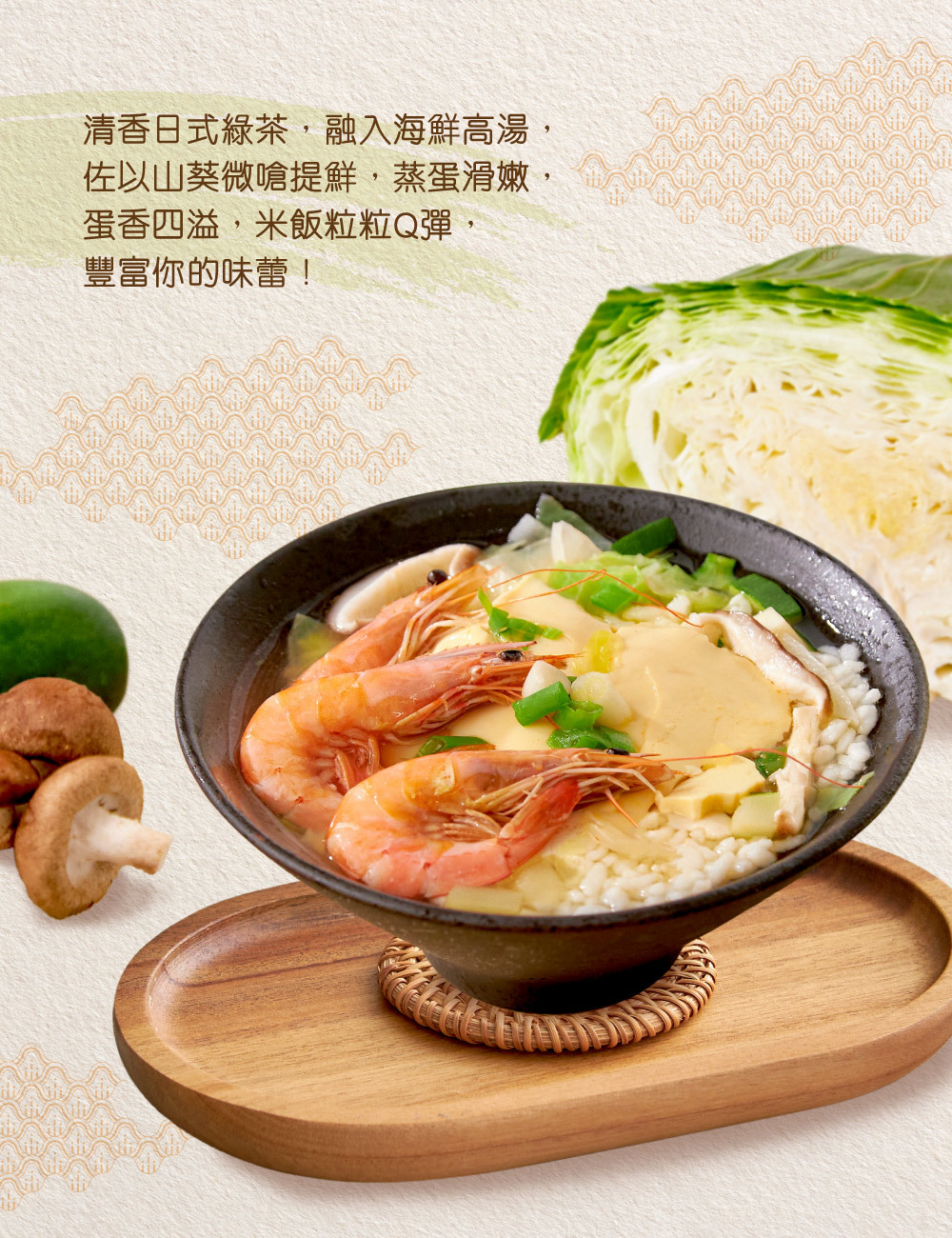 清香日式綠茶,融入海鮮高湯,佐以山葵微嗆提鮮,蒸蛋滑嫩,蛋香四溢,豐富你的味蕾!