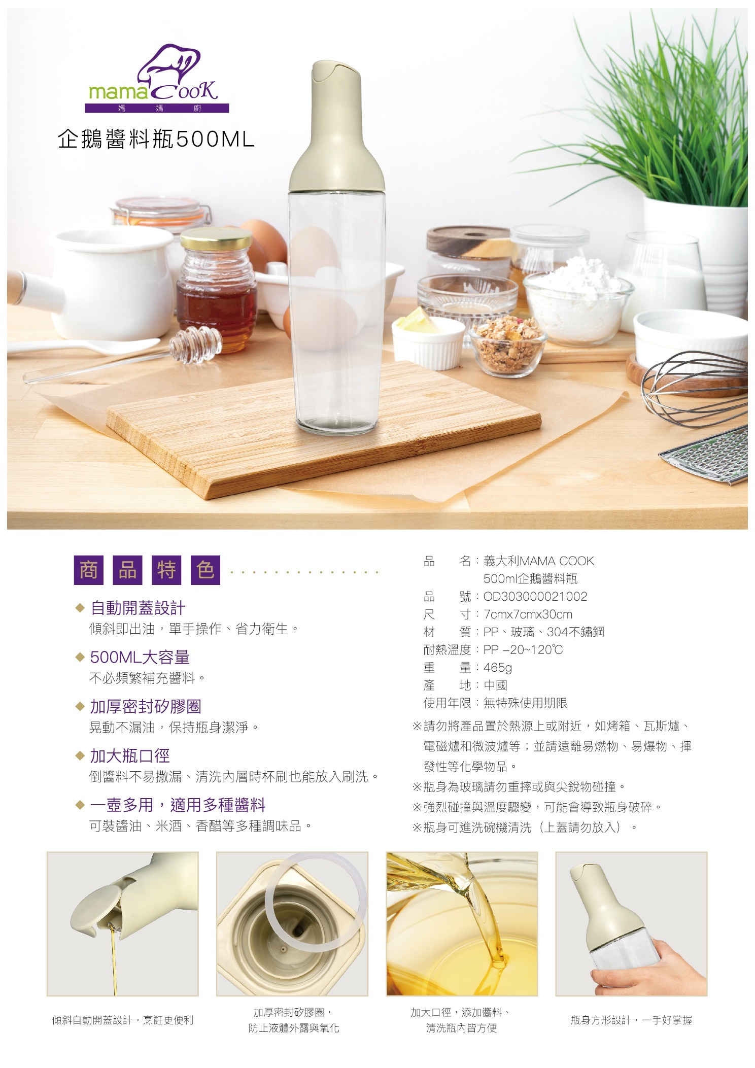 *自動開蓋設計,傾斜出油不沾手