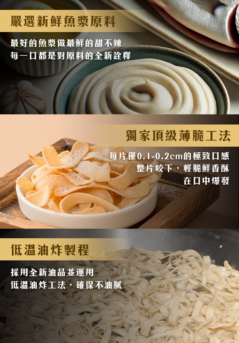 嚴選新鮮魚漿原料,每片僅0.1-0.2cm的極致口感,清爽薄脆。