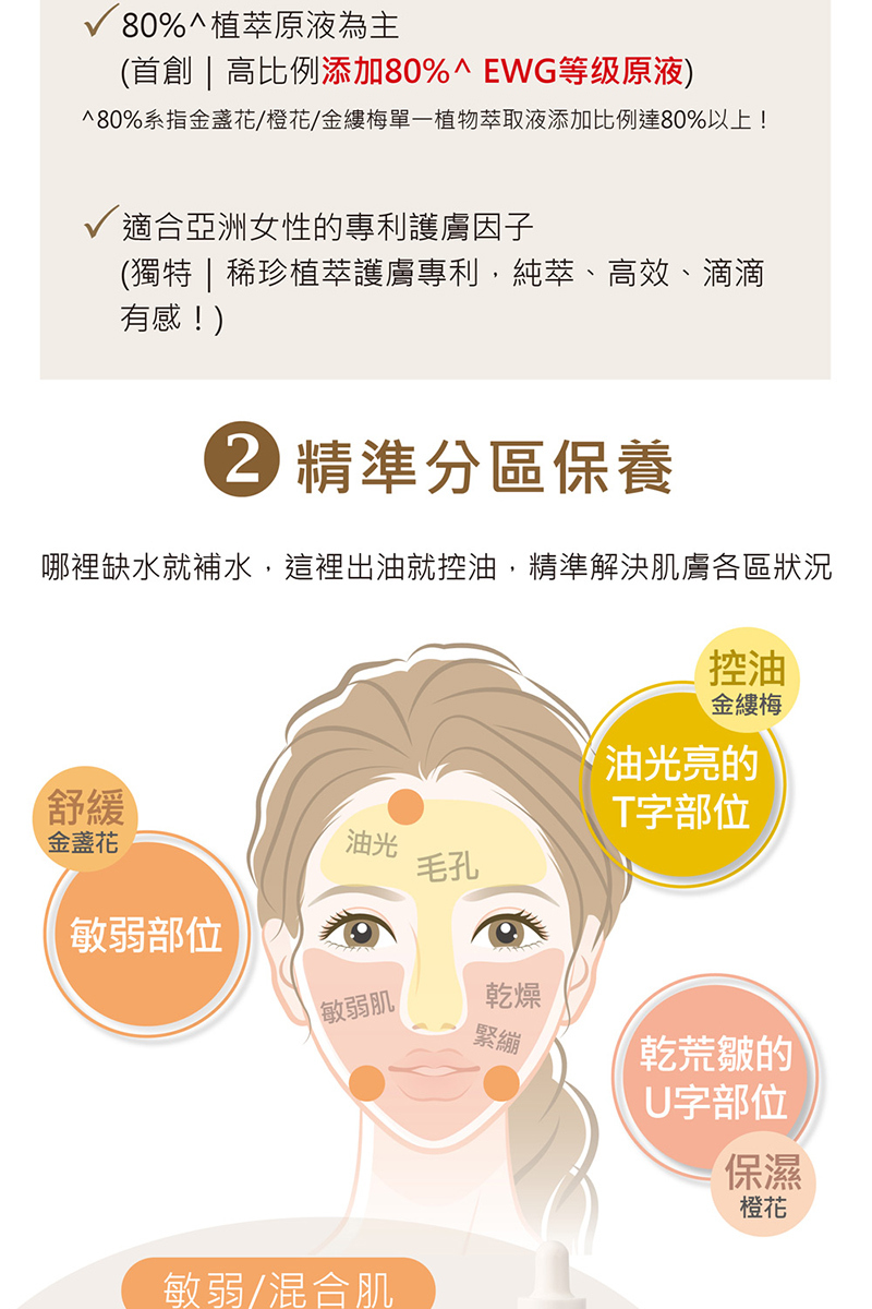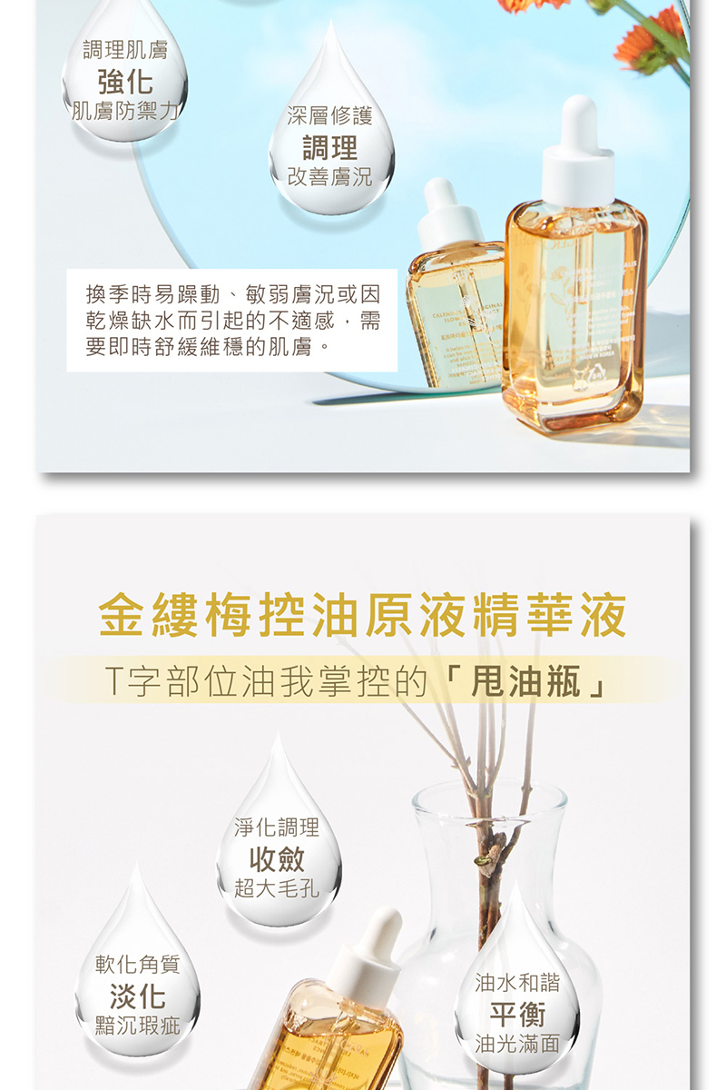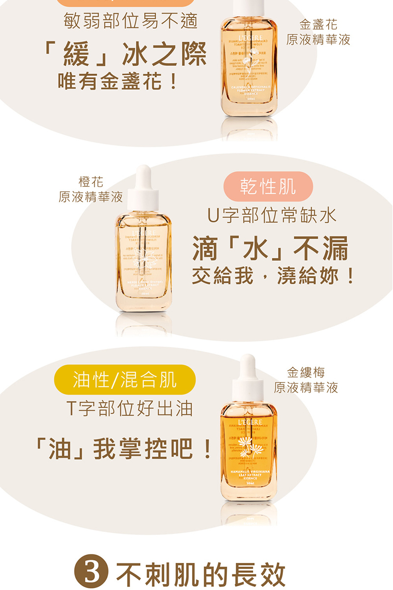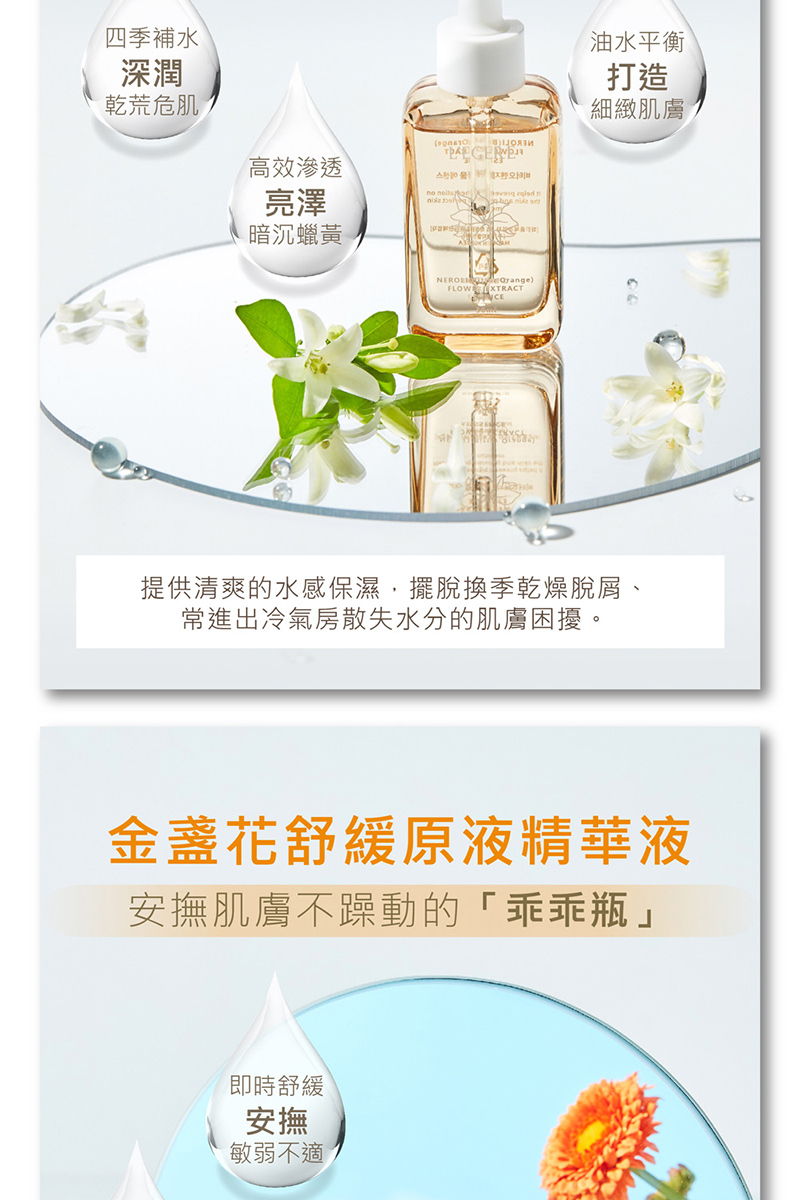 *金盞花:舒緩 / 金縷梅:控油 / 橙花:保濕