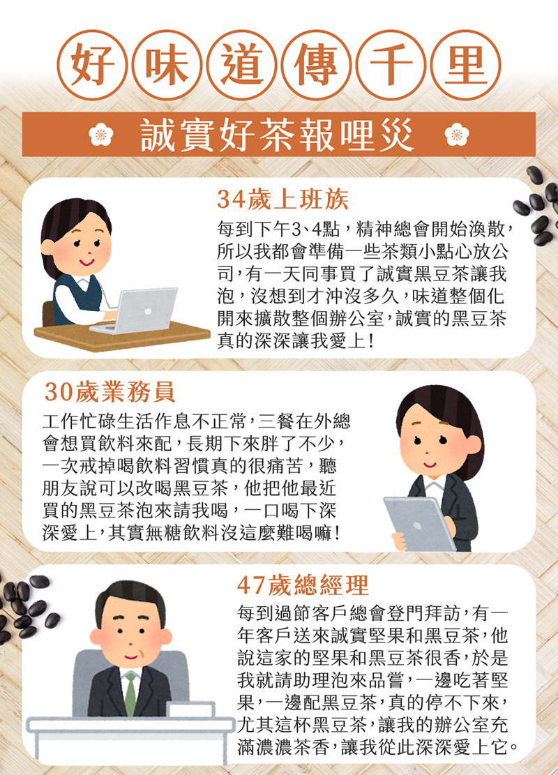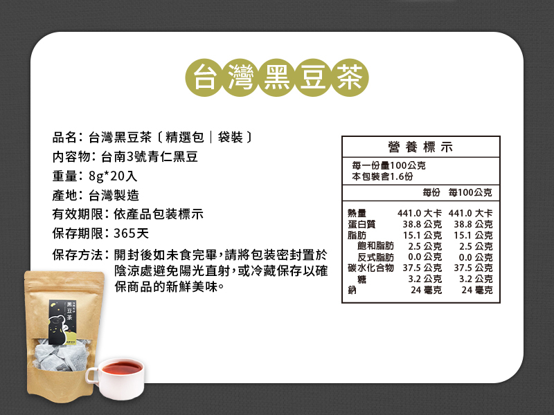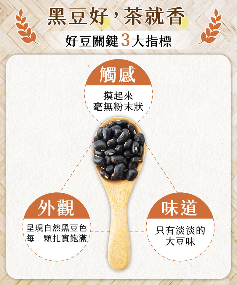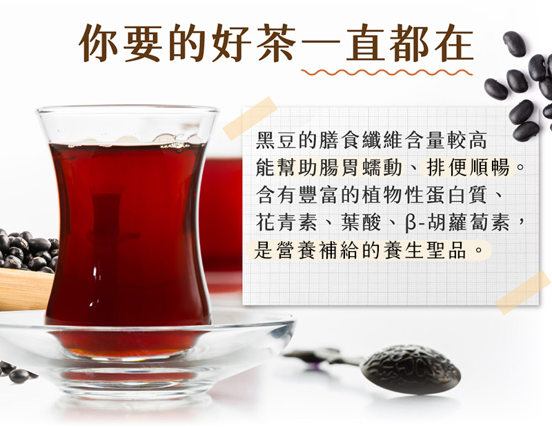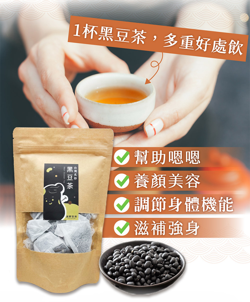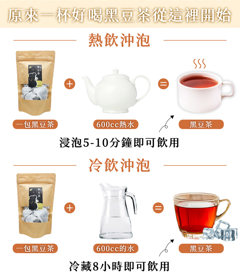 熱飲沖泡:一包黑豆茶可加入約600cc熱水沖泡,約5~10分鐘 即可飲用。