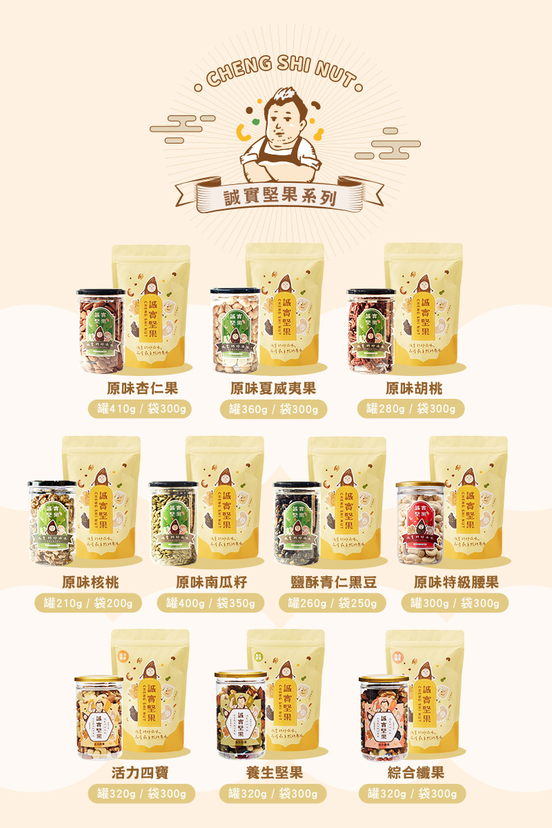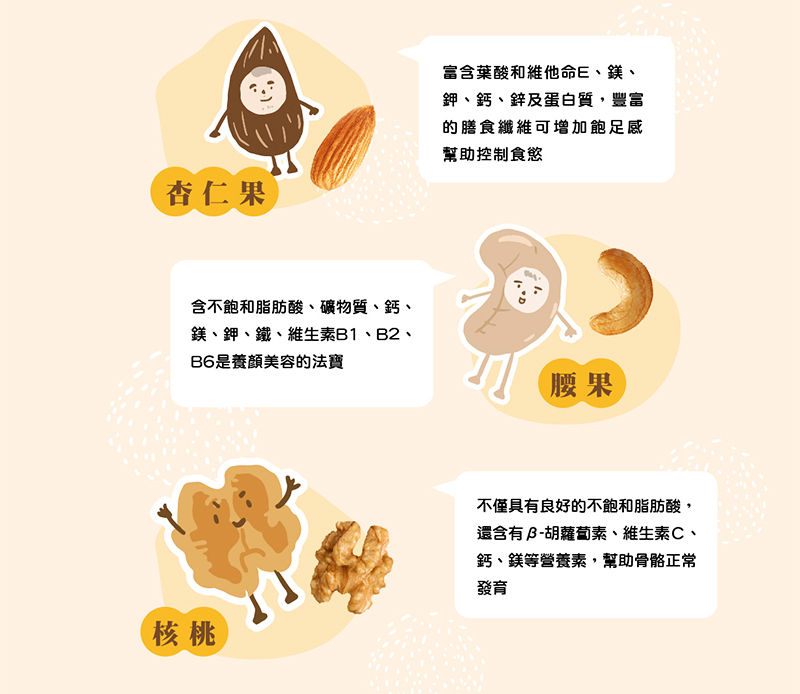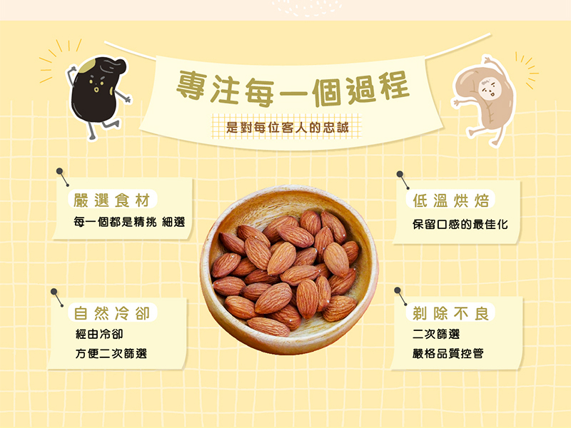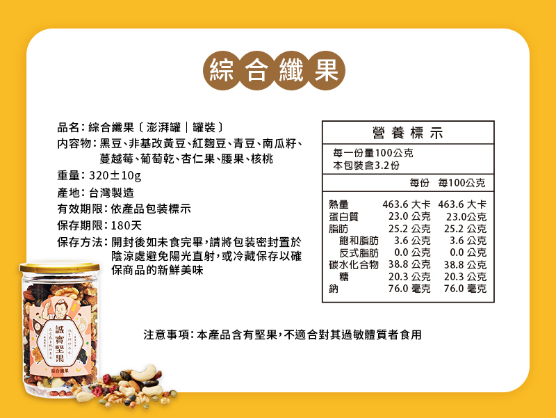 黑豆、非基改黃豆、紅麴豆、青豆、南瓜子、蔓越莓乾、葡萄乾、杏仁果、腰果、核桃
