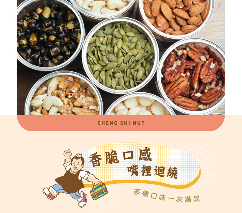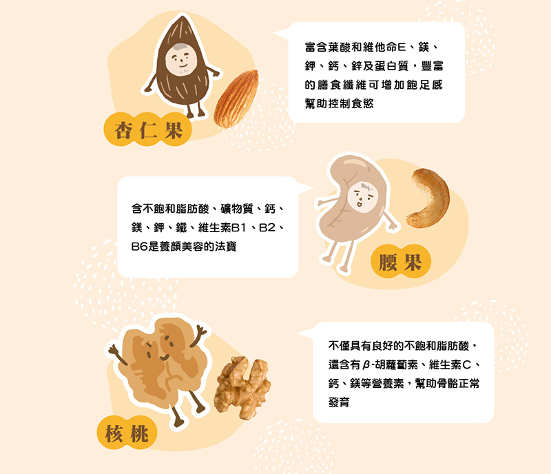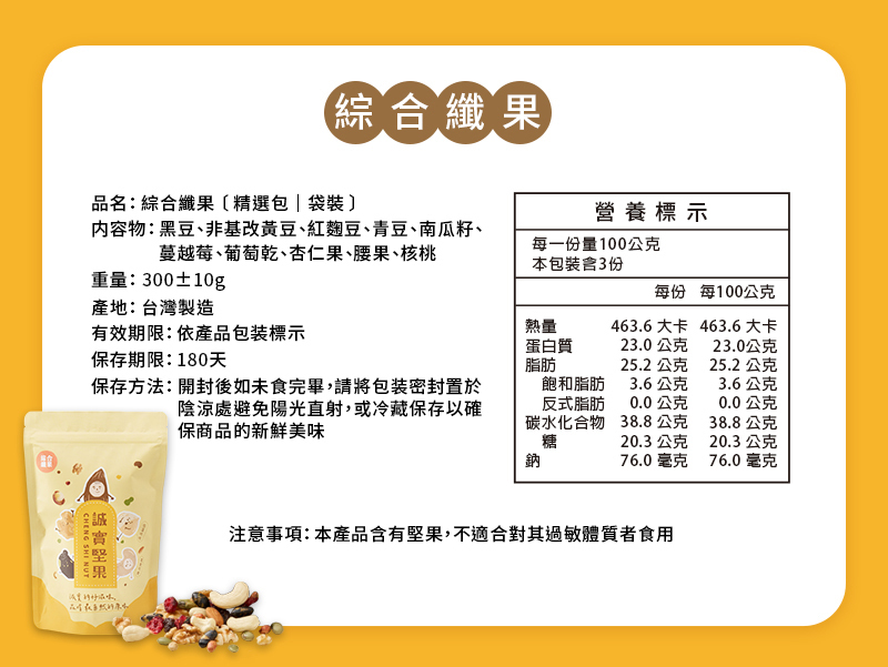 黑豆、非基改黃豆、紅麴豆、青豆、南瓜子、蔓越莓乾、葡萄乾、杏仁果、腰果、核桃