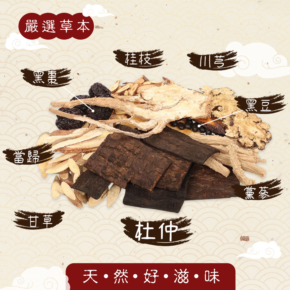杜仲、當歸、川芎、黑棗、黨参、桂枝、黑豆、甘草
