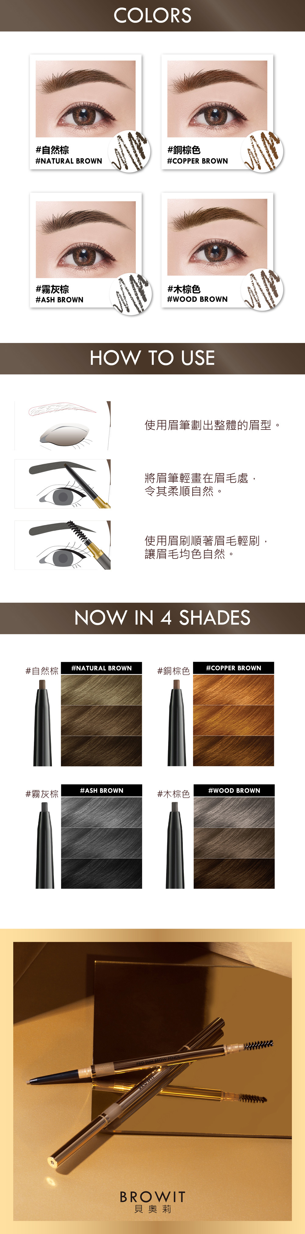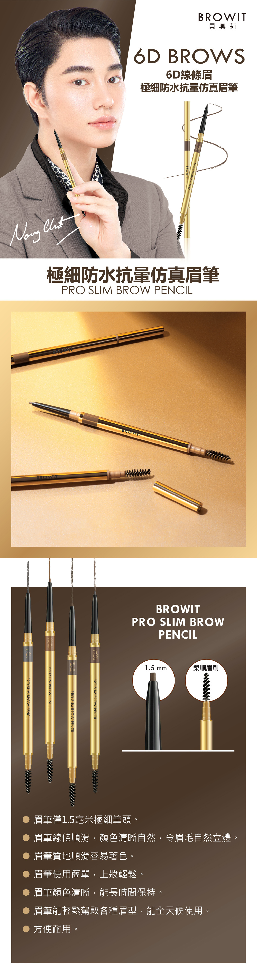 特色:1.5mm極細眉筆,眉筆線條滑順,容易著色,輕鬆畫出你真毛流,顯色度高,長效持妝