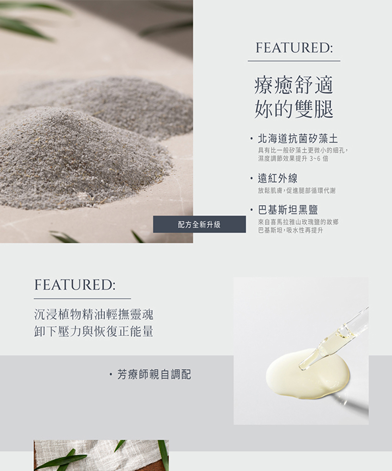 A:經典款足貼新添加吸水效果更好的「北海道抗菌矽藻土」、遠紅外線與複方精油,搭配精油的療癒力,腿部放鬆與循環的效果更加顯著!
