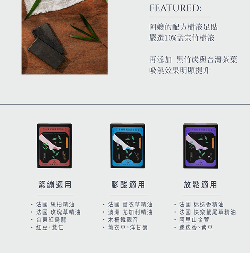 A:阿嬤的配方全系列樹液足貼孕婦皆可安心使用,特別推薦台東紅烏龍黑足貼!足貼含有少量精油,若體質敏感者,建議先詢問主治醫師。