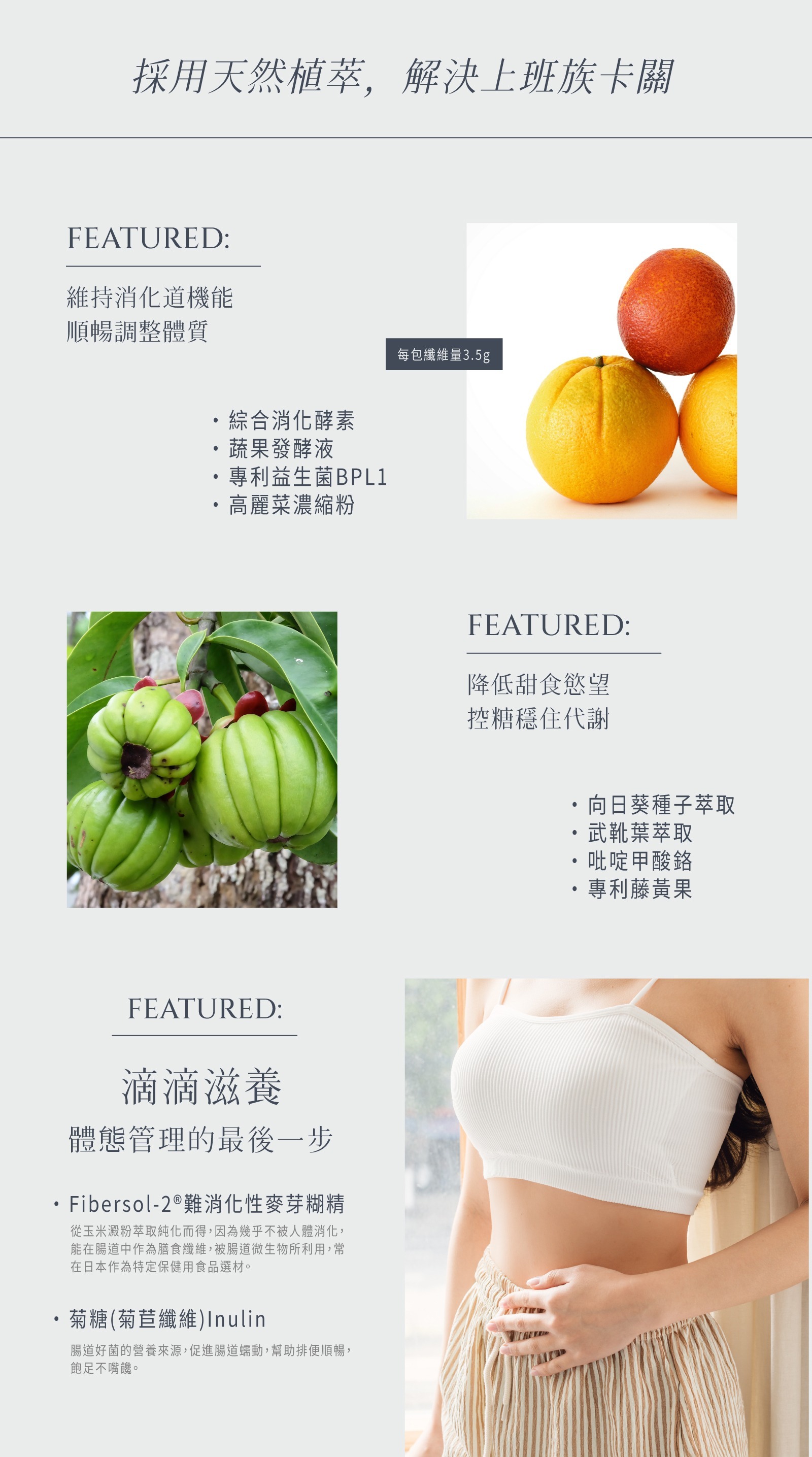 綜合消化酵素、專利益生菌BPL1、武靴葉萃取、專利藤黃果、菊糖(菊苣纖維)Inulin